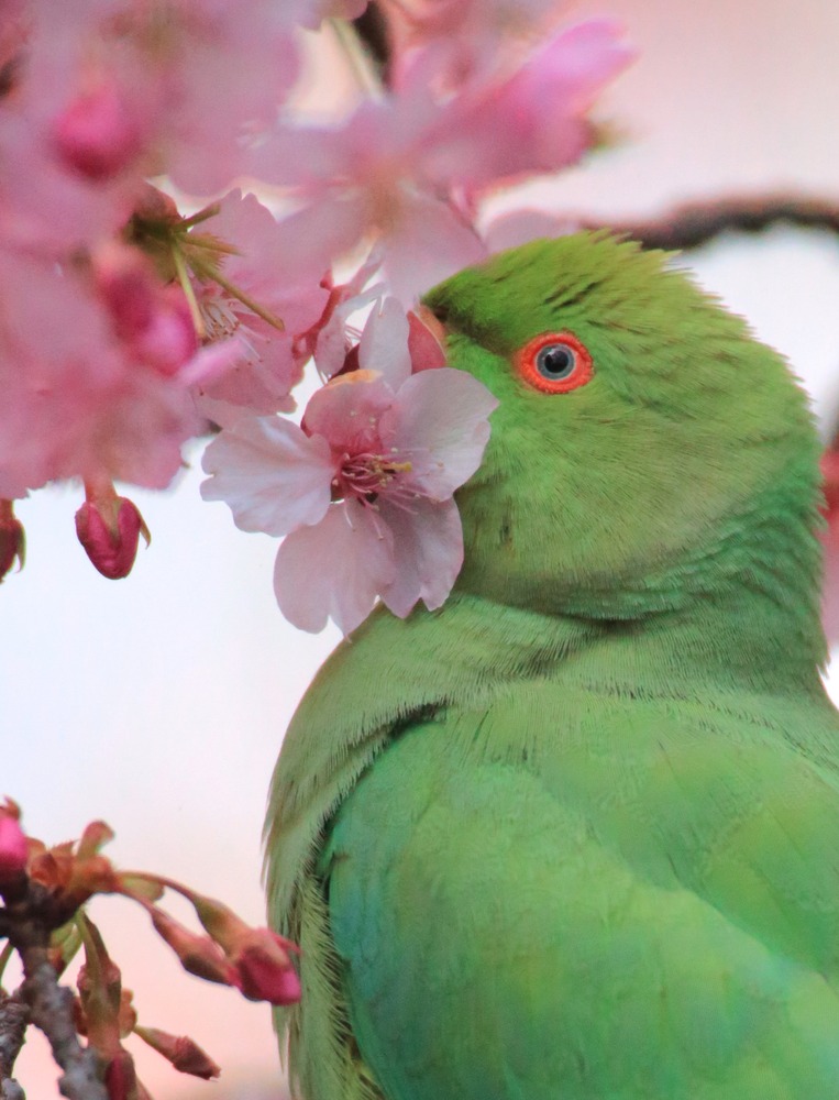 満開の河津桜に飛来したワカケホンセイインコです。遠慮がちに枝間を歩いて花を軸ごと千切って蜜を吸います。 彼等の食後には、まだ萎れていない新鮮な花が散乱しています。