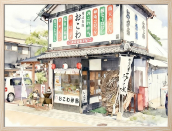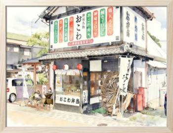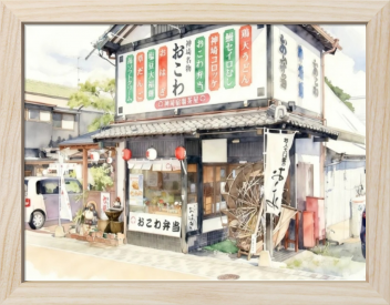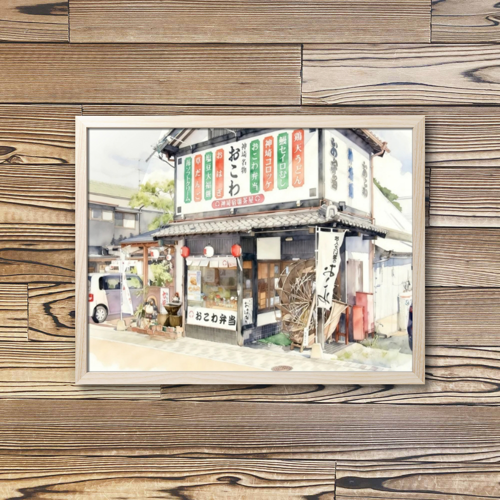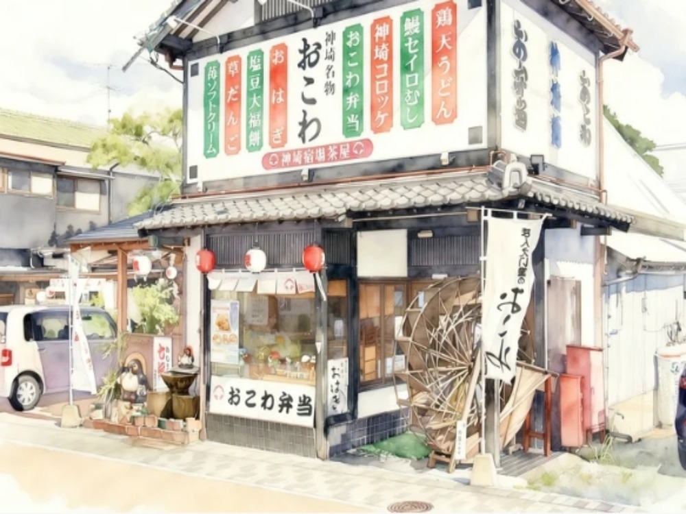 青空の下、大きな木製水車や色鮮やかなお品書きの看板が目を引く「神崎宿」の和菓子・お弁当店を、繊細な水彩画のタッチで情緒豊かに描いた、新旧の文化が調和する街角の風景です。