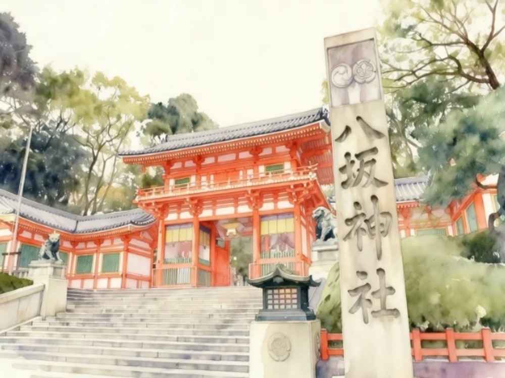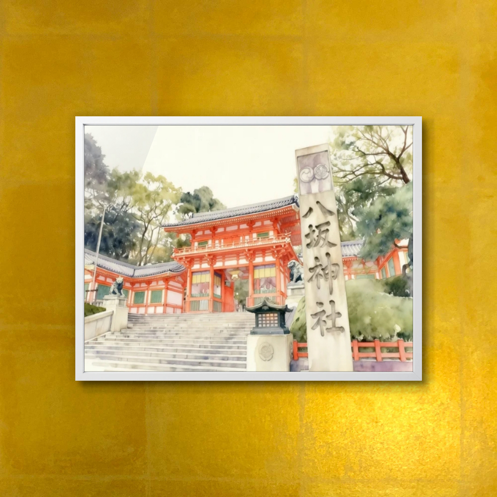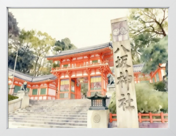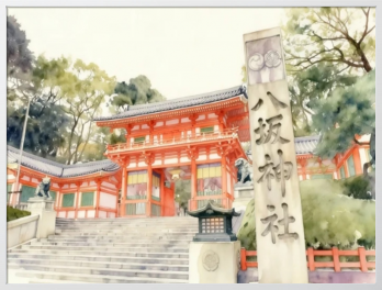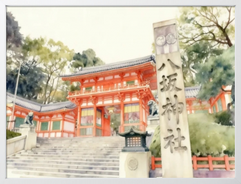 京都の祇園にそびえ立つ朱塗りの西楼門を水彩画風の柔らかなタッチで描いたこの作品は、日本三大祭りの一つである祇園祭の総本社であり、厄除けや美の神様としても親しまれる歴史ある八坂神社の象徴的な佇まいを幻想的に表現しています。