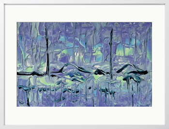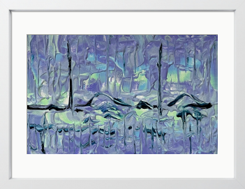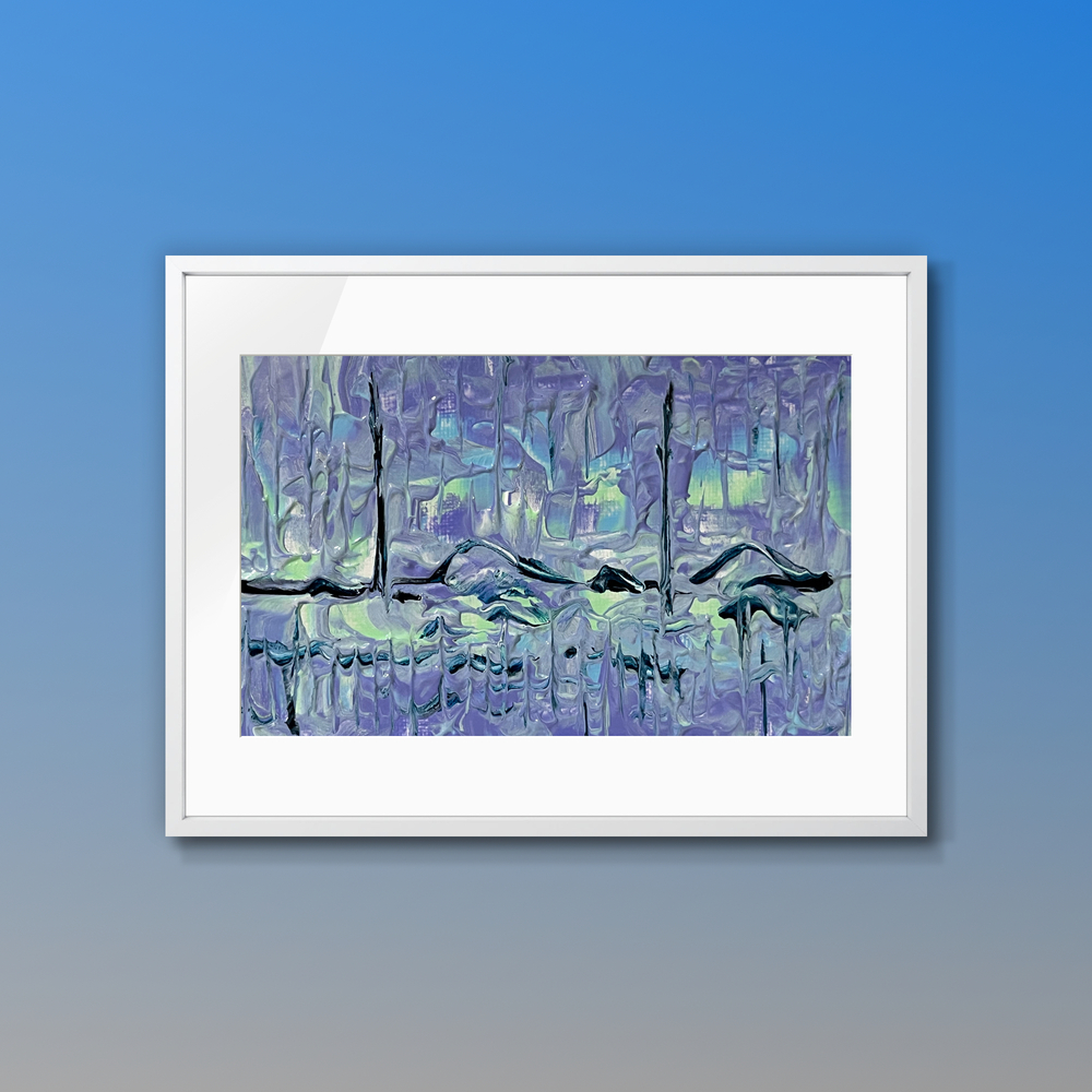 美しさと神秘が融合した静かな夜の森が、紫のヴェールに包まれて揺らめきく幻想的な風景を表現した作品です。木々のシルエットが水面に溶け、夢のような静寂が広がります。心地よい静けさの中で新たな発見を楽しむことができ、日常に新しい彩りを添えてくれることでしょう。
