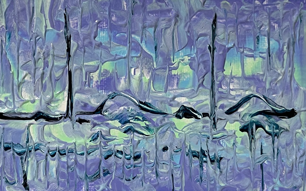 Veiled Nocturne Grove (180) – A mystical abstract acrylic painting that transforms the living rhythms of an electrocardiogram into an enchanted nocturnal forest. Delicate, undulating heart-wave lines ripple through misty tree silhouettes and moonlight veils, blending deep indigo, soft emerald, and ethereal silver glows into a breathing, dreamlike woodland.