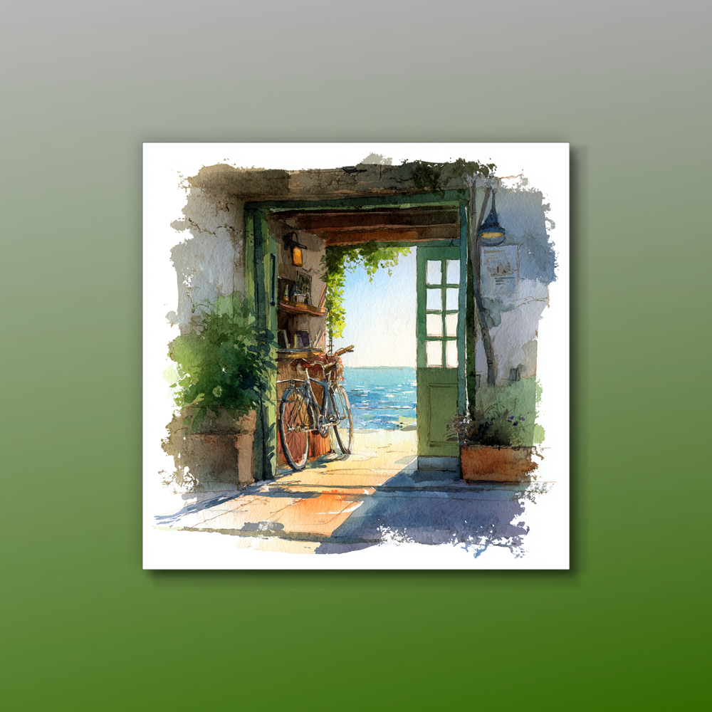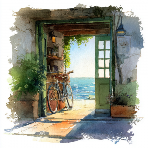 扉を開ければ、そこは光降る海。心地よい潮風を感じる旅先の情景を、溶け合う色彩と柔らかな光のグラデーションで描きました。
