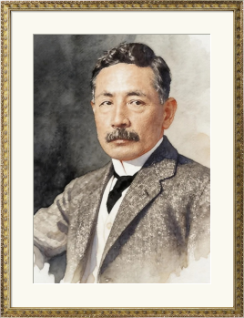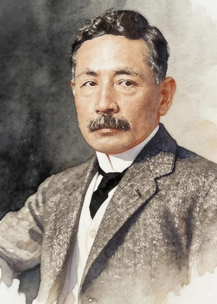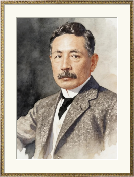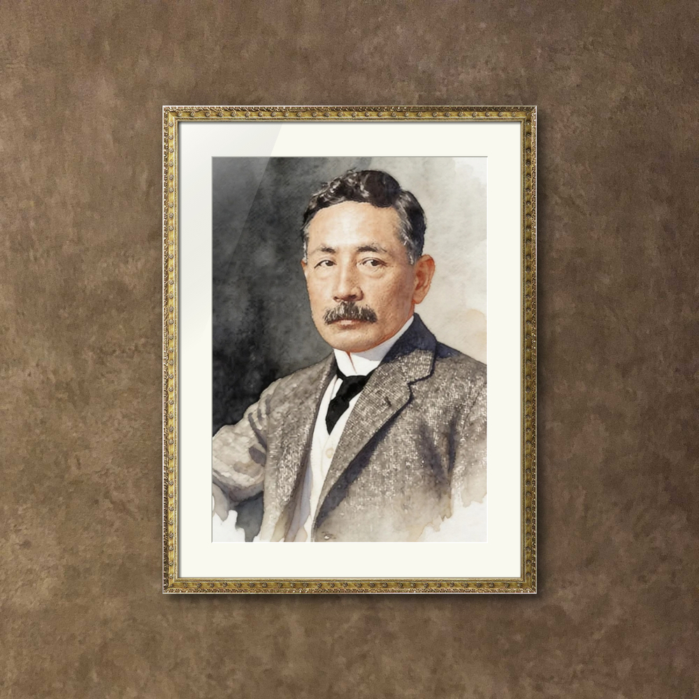 この作品は、日本の近代文学を代表する小説家であり、かつて千円紙幣の顔としても親しまれた夏目漱石を、温かみのある水彩画風のタッチで描いたポートレートです。 ツイードのジャケットにネクタイを締めた知的な装いと、彼のトレードマークである立派な口髭、そして思索に耽るような穏やかながらも鋭い眼差しが、明治から大正にかけて『こころ』や『吾輩は猫である』などの名作を世に送り出した文豪の気品と苦悩を情緒豊かに表現しています。