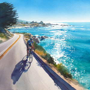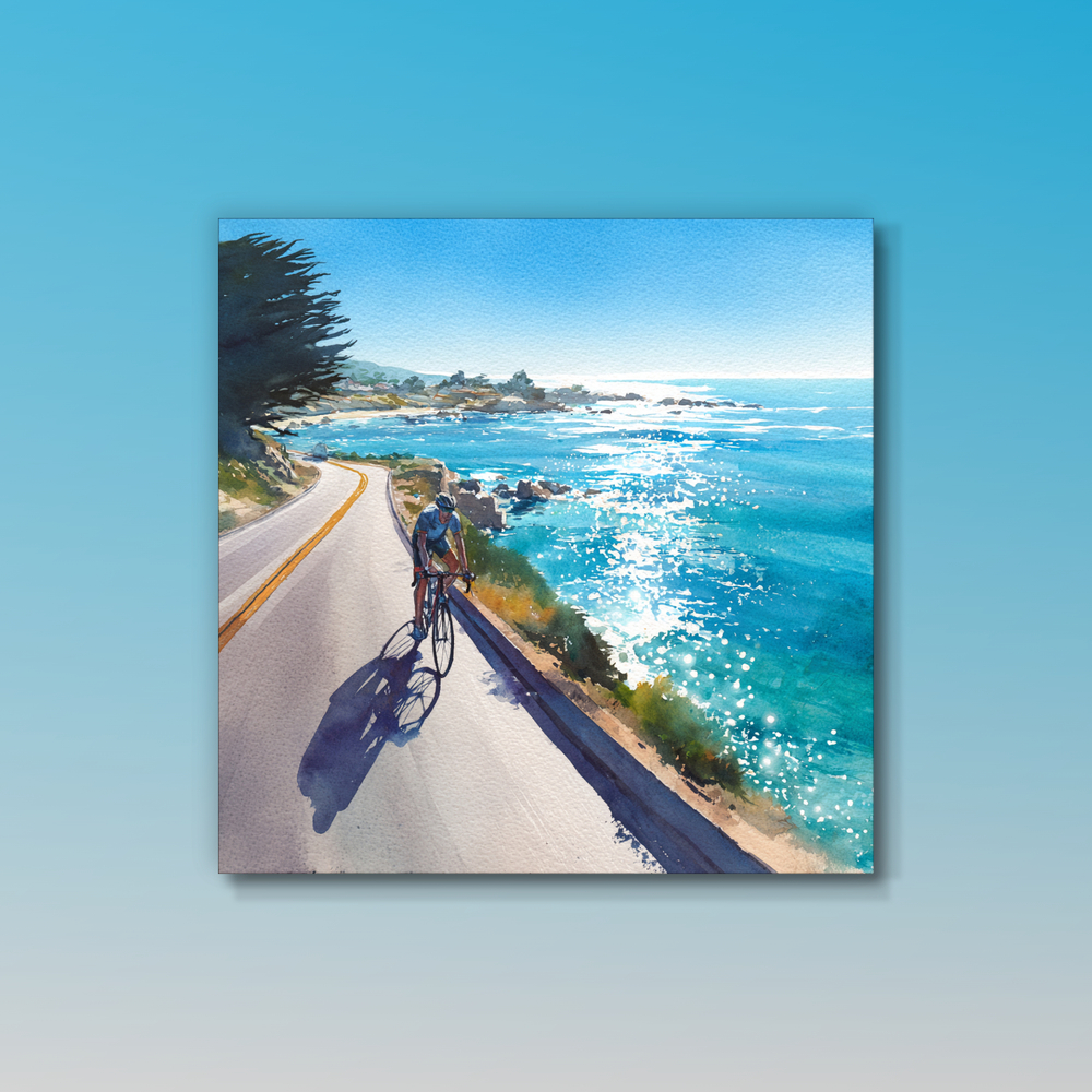 潮風を感じてどこまでも。眩しい光と青い海を駆け抜ける、自由で爽快な一瞬を鮮やかに描き出しました。