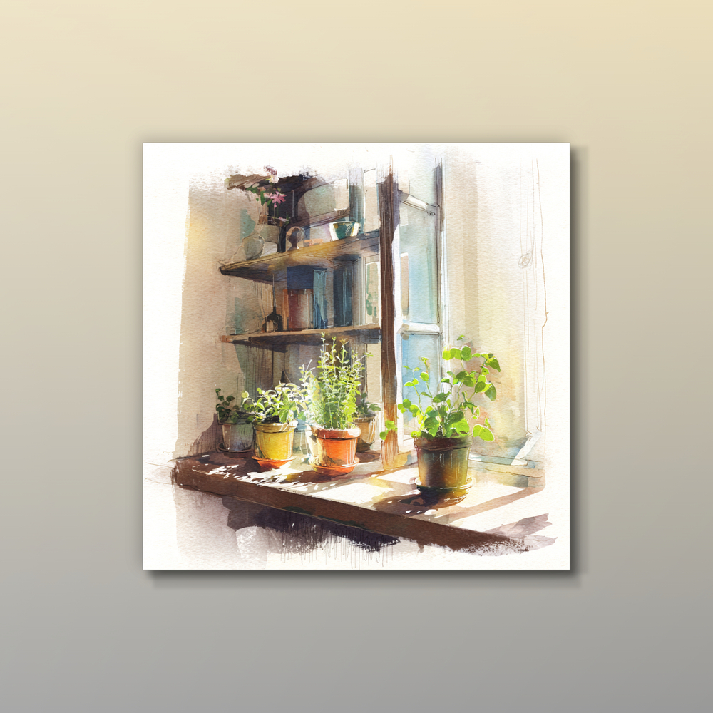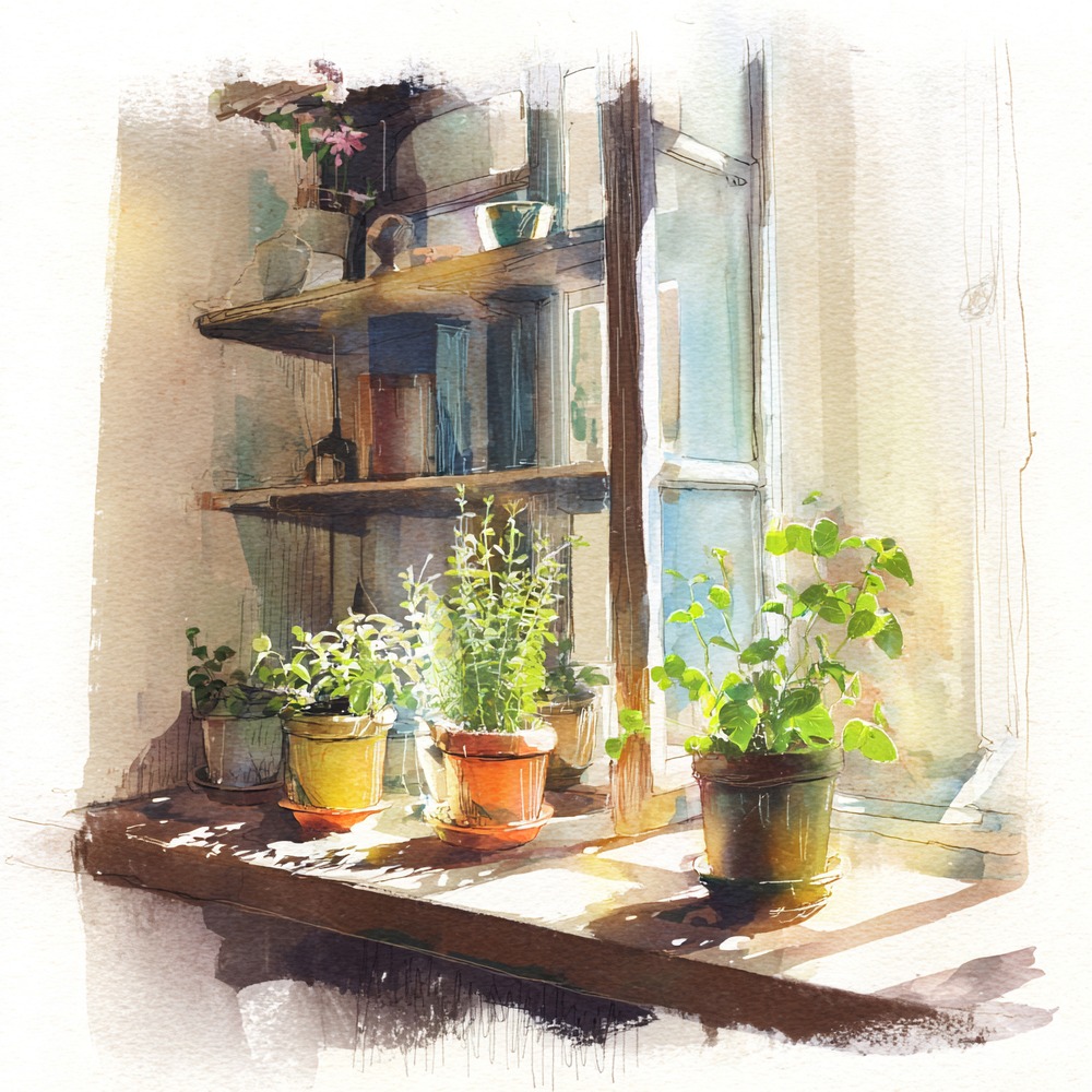 窓辺の光をたっぷりと吸い込んだ、瑞々しい緑。そんな何気ない一場面に宿る、静かな生命力を描きました。