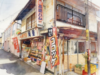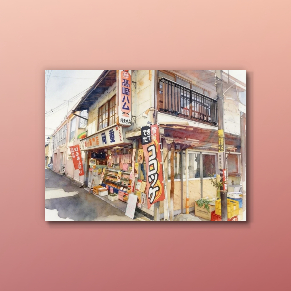 この作品は、昭和の面影を残す日本の古い精肉店を、柔らかな陽光が差し込む水彩画のような繊細なタッチで描いており、店頭に並ぶショーケースや「コロッケ」と書かれた赤い幟が、どこか懐かしく温かみのある日常のひとコマを表現しています。