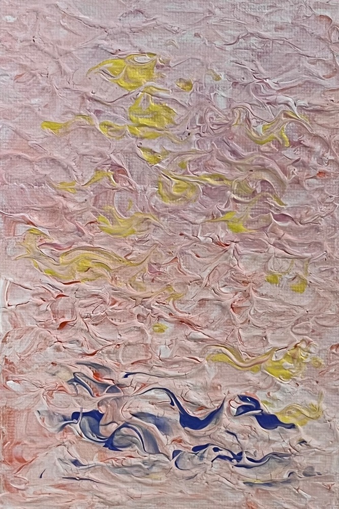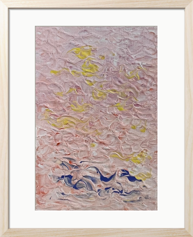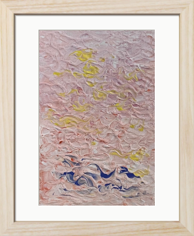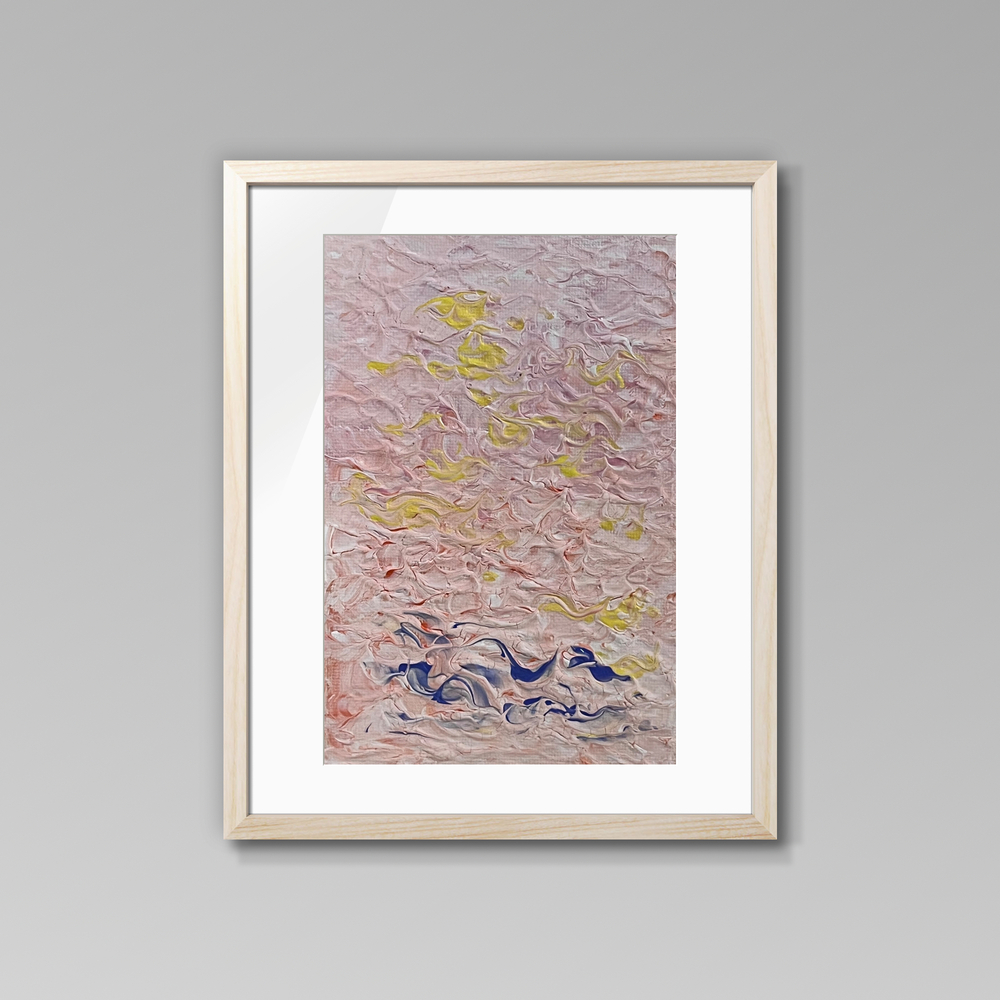 淡いピンクの海に、黄色と青の炎のような流れが絡み合うこの作品は、幻想的な世界での情熱を表現しています。優しい筆致が生み出す独特な雰囲気は、心に温かな余韻を残し、観る人々に心の安らぎをもたらします。まるで幻想的な世界に誘われるような、特別な体験をお届けする一枚です。