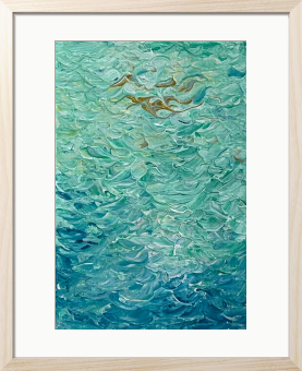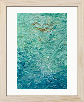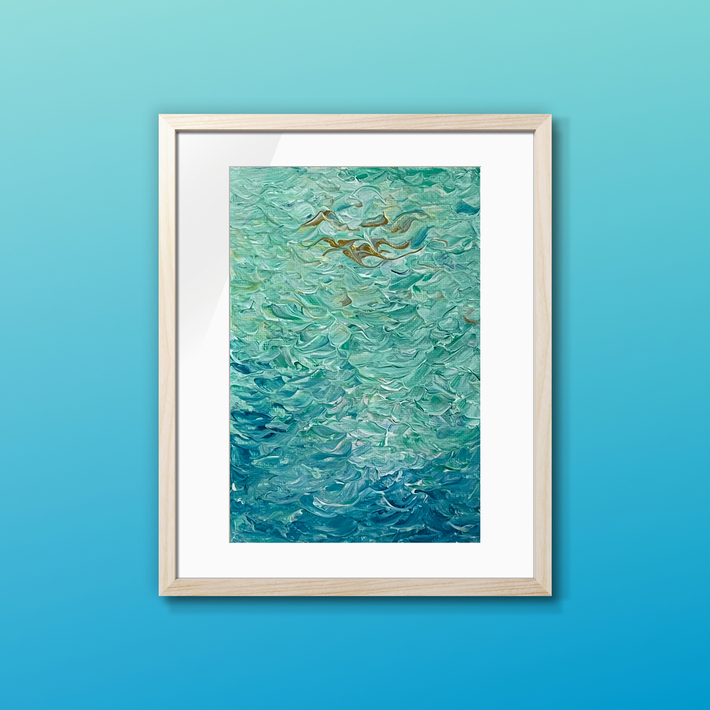 深い緑の海を背景に、金色の流れが優雅に舞うこの作品は、静けさと神秘的な輝きを兼ね備えた一枚です。重なる層が生み出す静かな波紋が、心の内側に平穏をもたらし、観る人々に特別なひとときを提供します。まるで深海の底から光が差し込むような、幻想的な美しさをご堪能ください。