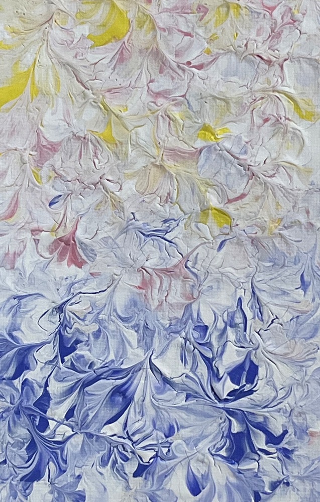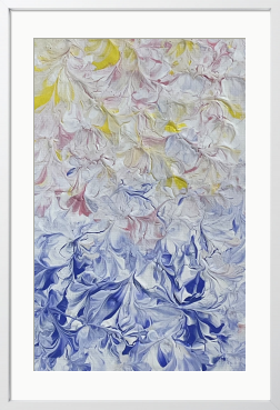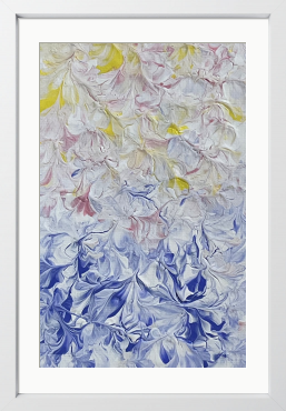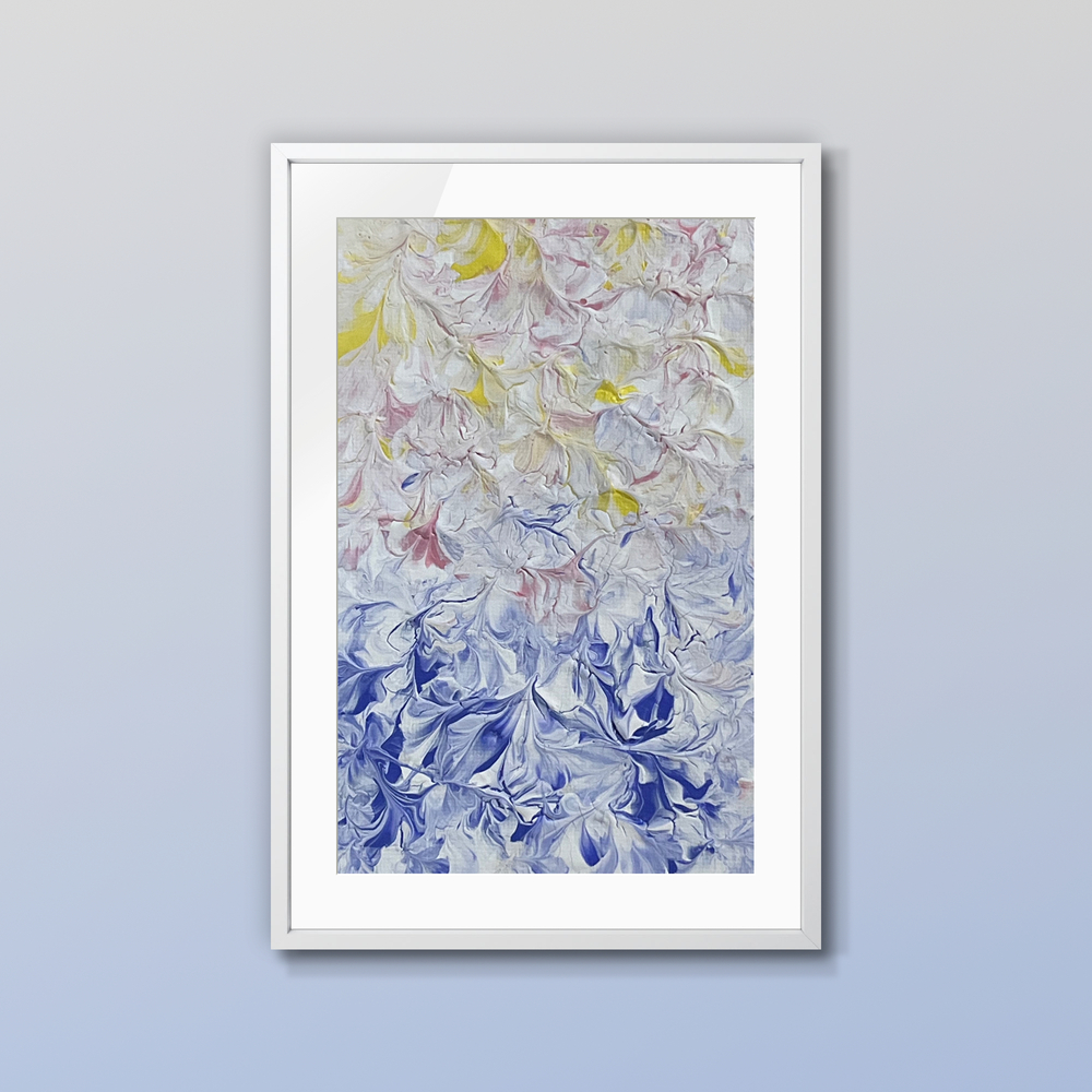 爽やかなニュアンスブルーや温かな黄色、可憐なピンクが白に溶け込み、春の訪れを鮮やかに表現しています。この作品は、光を透かすようなグラデーションが生み出す神秘的な世界観が、穏やかな心の輝きを届けてくれます。自然の息吹を感じさせる1枚です。