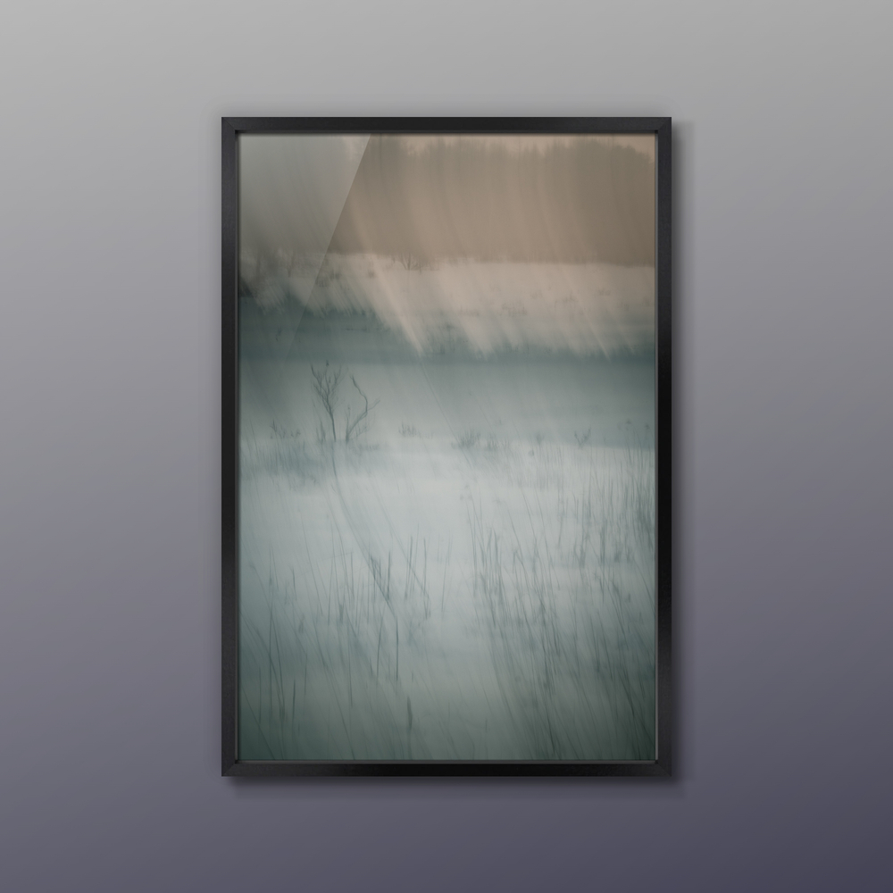 凍てつく霧に包まれた、冬の霧ヶ峰。 視界を白く染める霧の向こうで、風景はその境界を失い、静かに揺らぎ始めます。 厳しい寒さの中に漂う、どこか夢のような、あるいは遠い記憶を呼び覚ますような不思議な質感。 飾る場所に静かな安らぎと、澄み渡る空気感をもたらしてくれる一枚です。