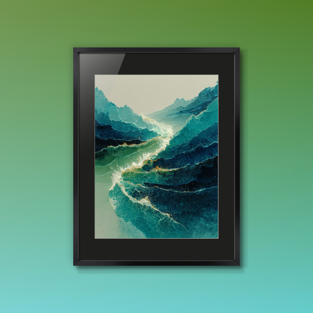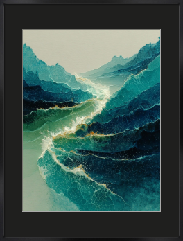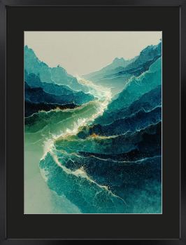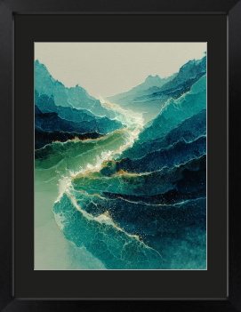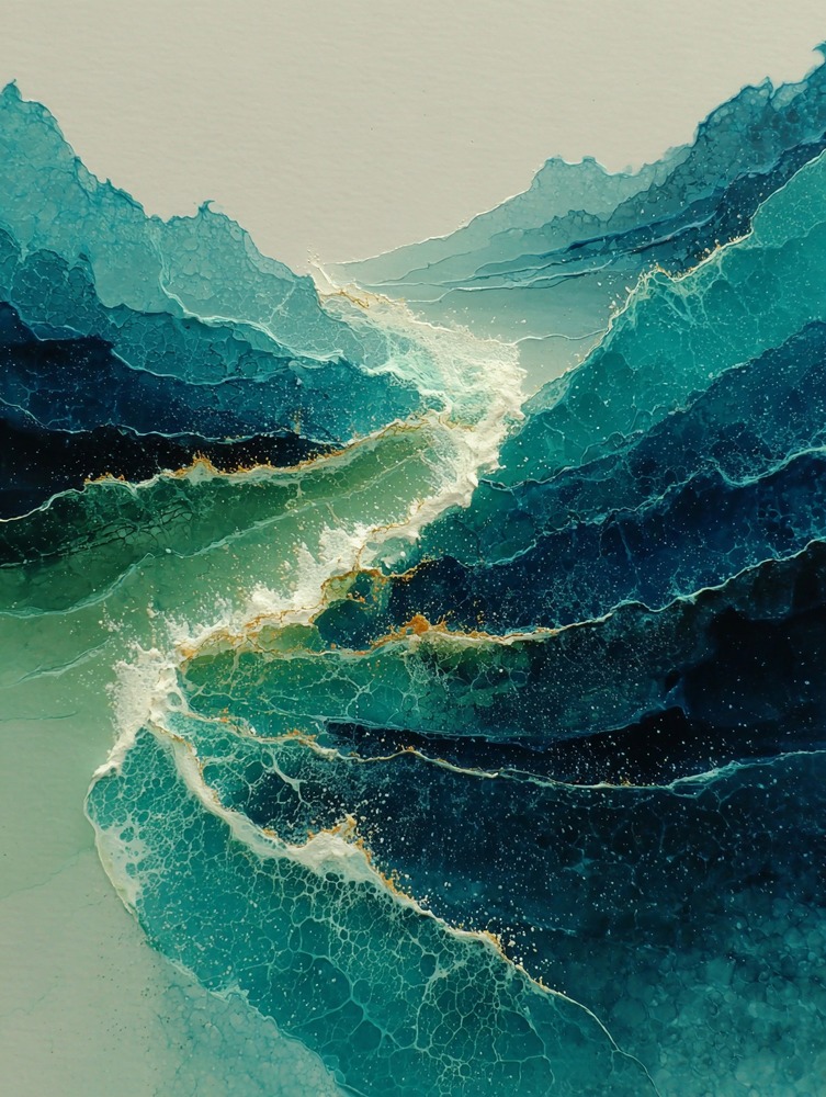 重なる青に引いた一筋のラインは、海に届く光の糸。眺めているだけで、心が波のように穏やかになる一枚です。