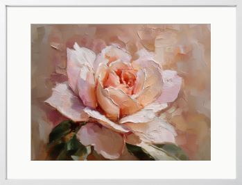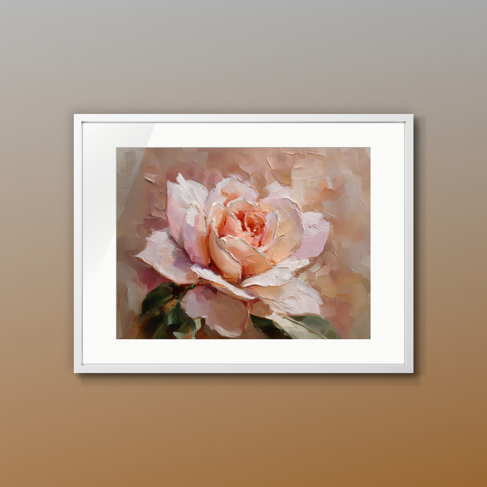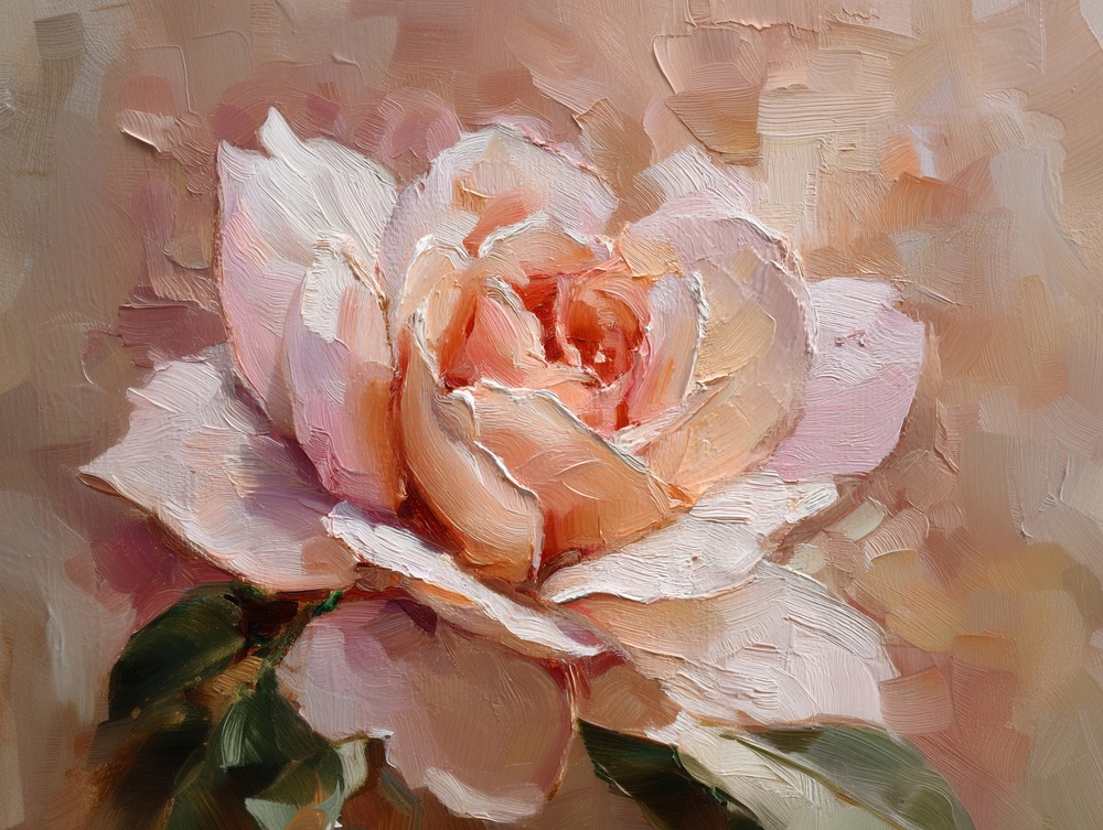重なり合う筆跡が、一輪の柔らかな表情を描き出します。指先に触れそうなほどの立体感と、淡い色彩の調和を楽しんで。
