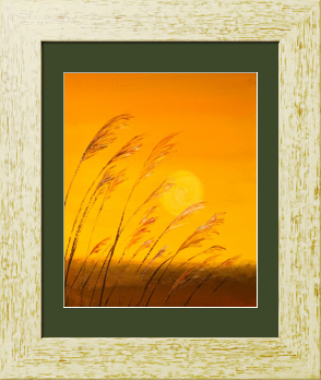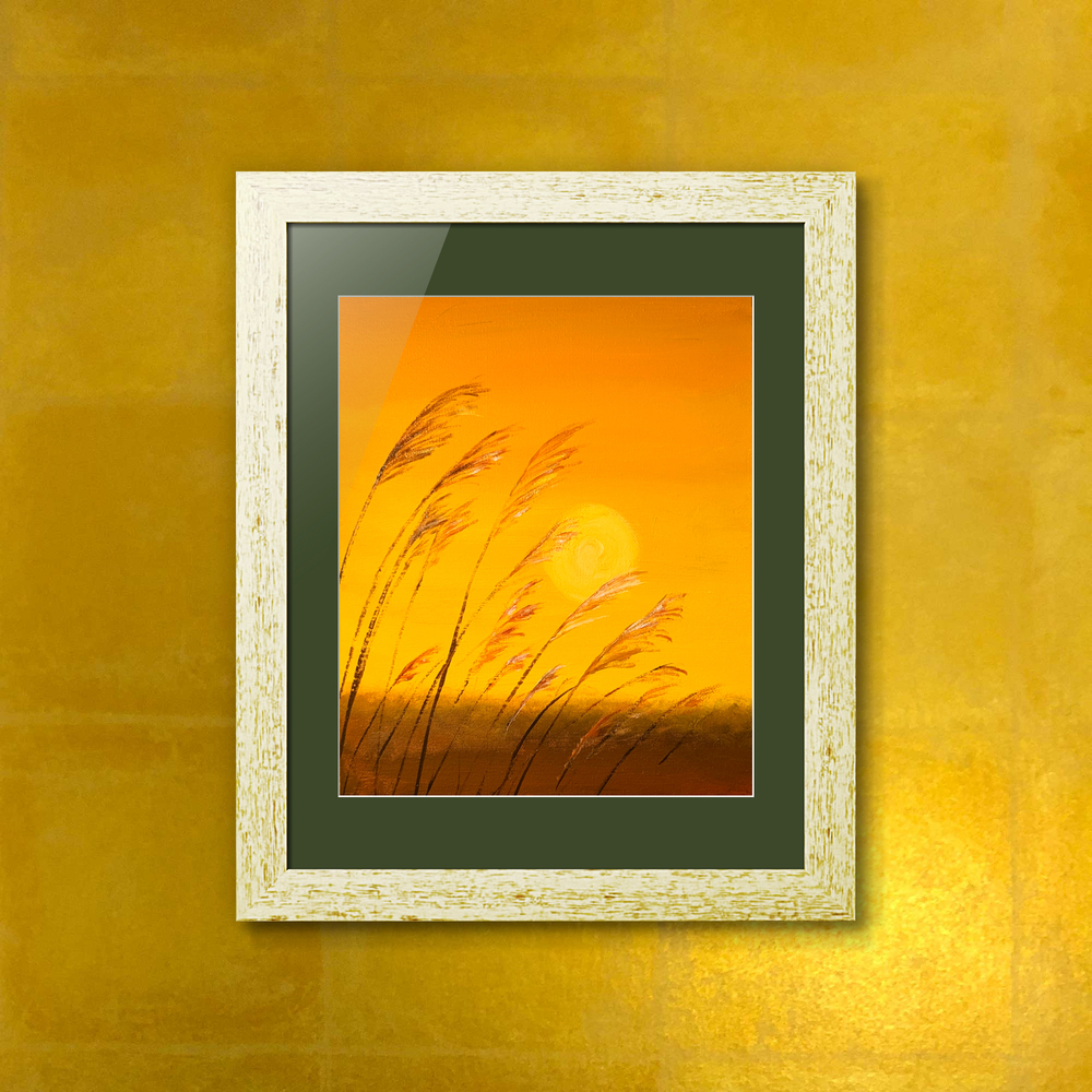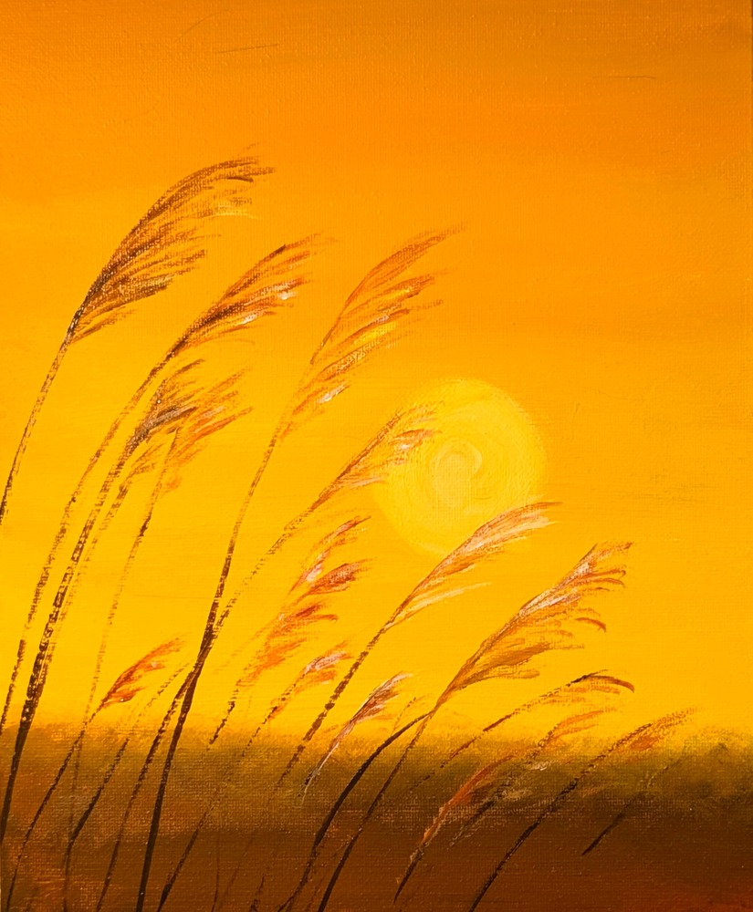 淡路島の秋の風を、リビングに招き入れる。 夕陽に透けるすすきの穂は、まるで時間を止める魔法のようです。忙しい一日の終わりに、この光を眺めるだけで、心の中に静かな凪が訪れる……そんな空間を演出したくて描きました。 落ち着いたトーンのインテリアに、穏やかな光のアクセントを添えていただければと思います。