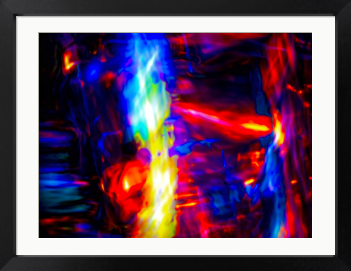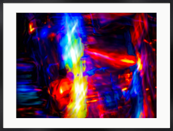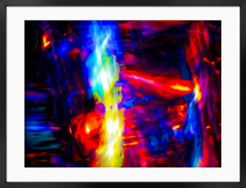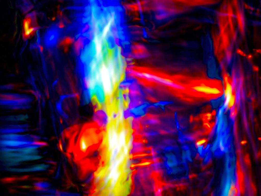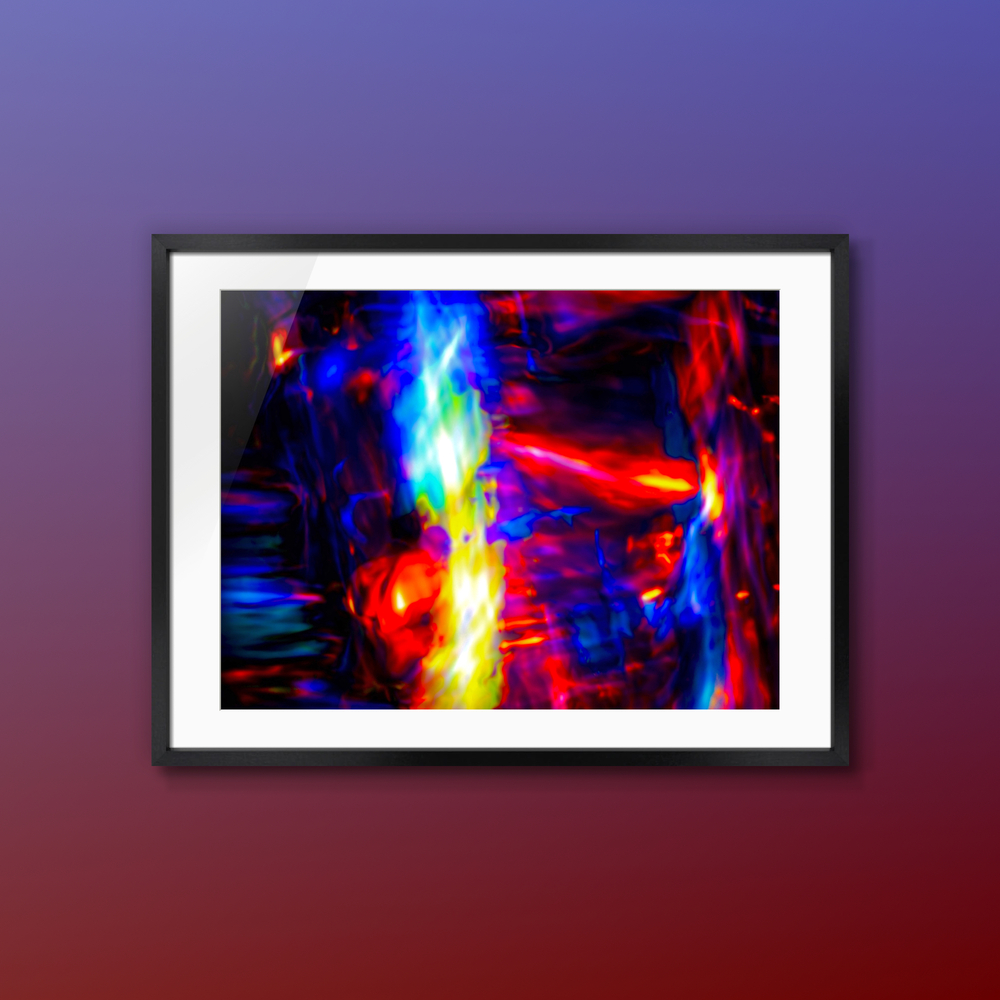 強い光は、ただそこにあるのではなく、周囲の流れを変え、色彩の方向を決め、画面全体に見えない重力のような構造を生み出していきます。Singularity of Light, Opus 002 は、青、赤、黄の鮮烈な色が揺らぎながら交差し、その中心に立ち上がる強い発光が、偶然に見える残像の中へひとつの秩序を与える作品です。