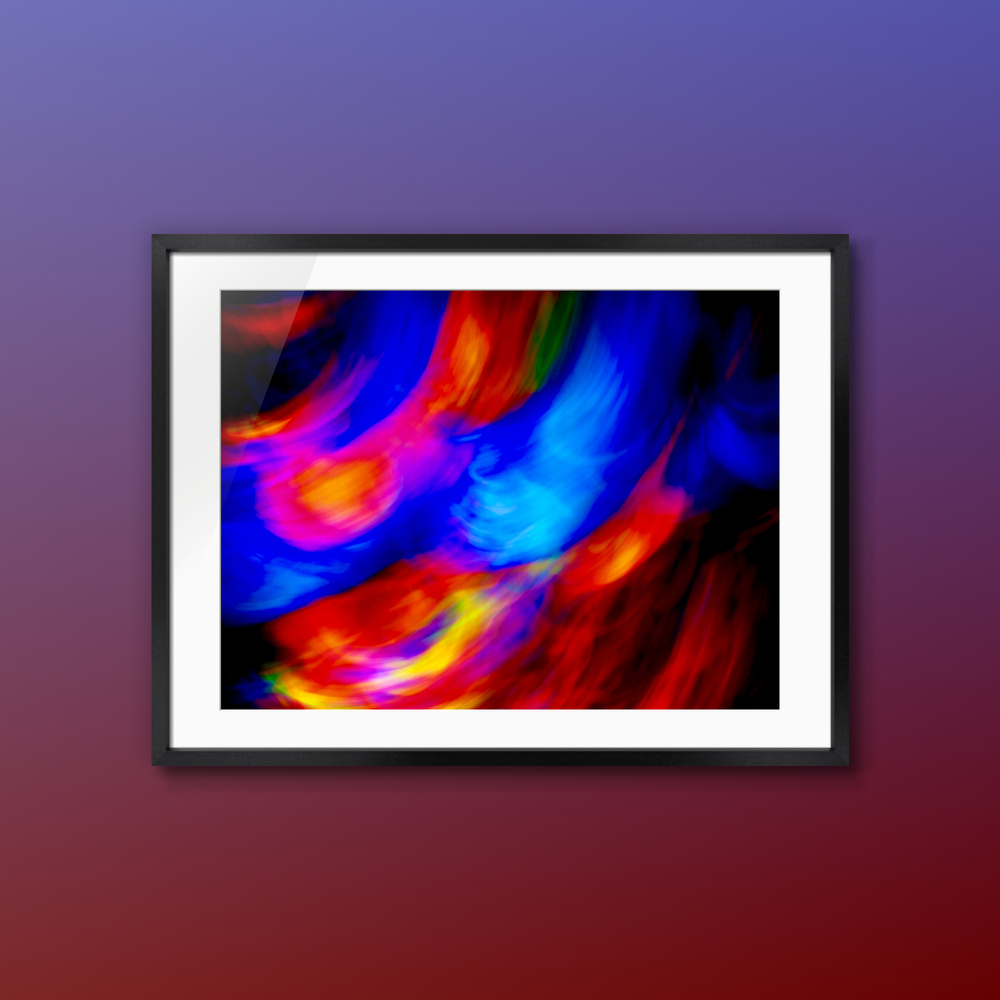 Turbulence of Spectrum, Opus 003 は、青を基調とした深い流れの中で、赤、橙、黄の光が渦を描くように交差し、色彩そのものが運動体として振る舞う瞬間を捉えた作品です。画面の中で色は静止した面ではなく、押し流され、巻き込まれ、拡散しながら、ひとつの大きな流れの中に組み込まれていきます。そこには単なる偶然のにじみではなく、力の偏りや方向の変化、増幅と減衰が共存する、乱流のような構造が潜んでいます。