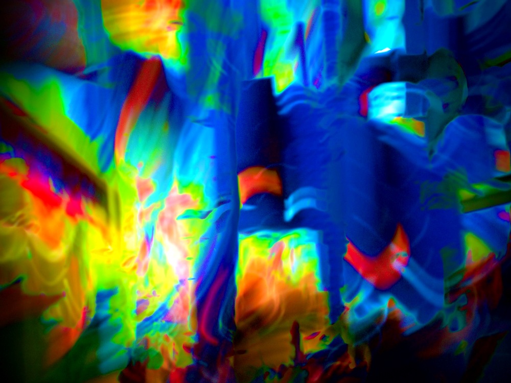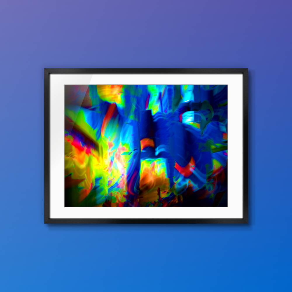 暗い青の場の中から、緑、黄、赤の光が局所的に立ち上がり、形やエネルギーが生成されていく作品。光はただ重なるのではなく、集中と拡散を繰り返しながら、場の中に新しい秩序を生み出しています。Field of Emergence, Op.012 は、完成ではなく“出現の過程”そのものを捉えた一枚です。