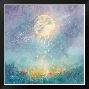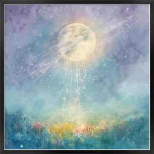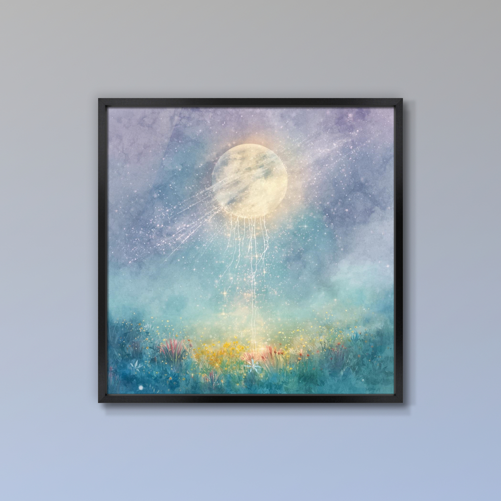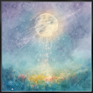 幻想的な月の光が大地へと降り注ぎ、宇宙と自然が静かに繋がる瞬間を表現したアート作品です。