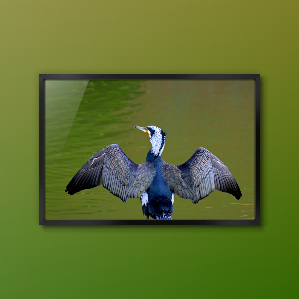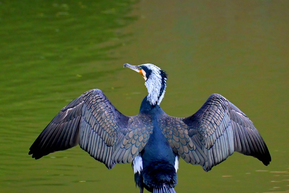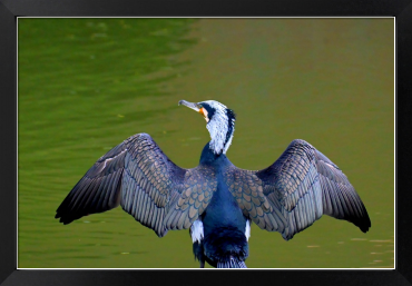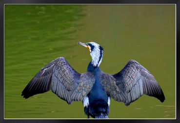 Title:羽を乾かす繫殖羽のカワウ