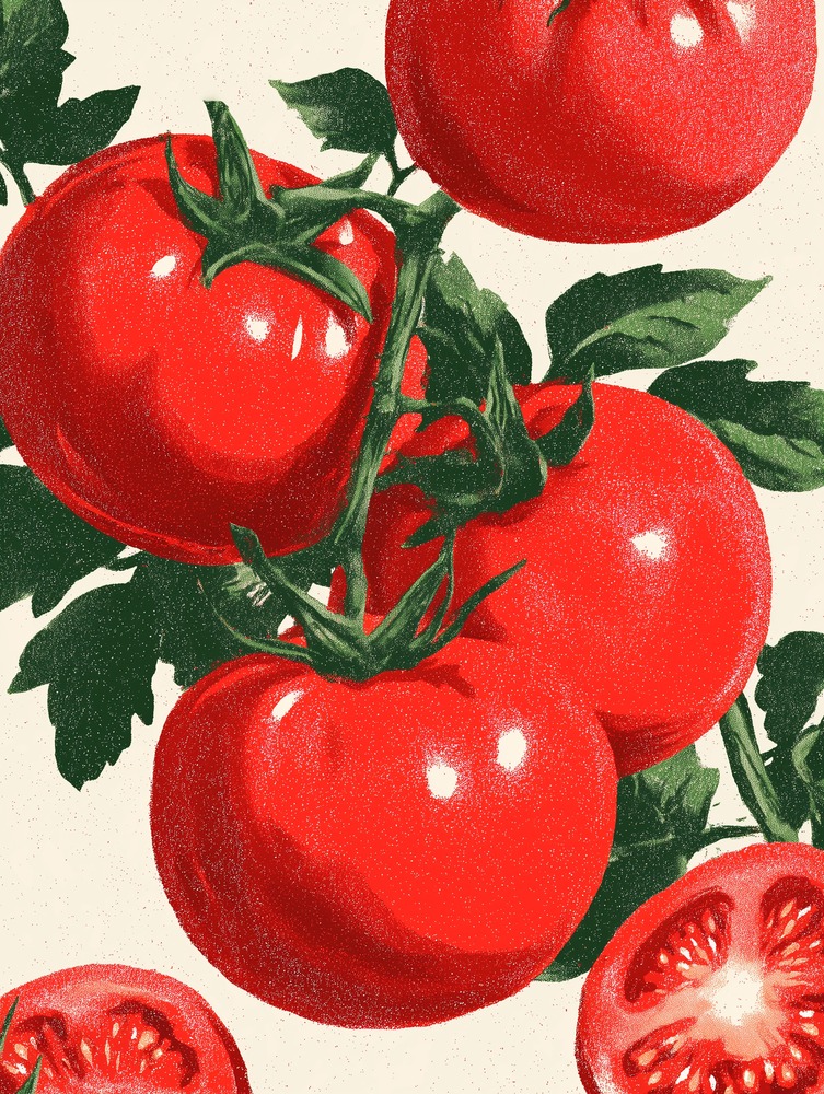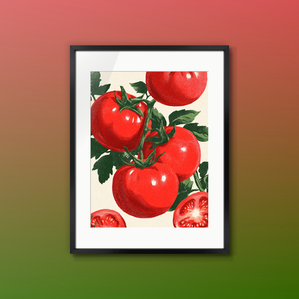 瑞々しい生命力が溢れ出す瞬間を、粒子感のあるテクスチャで表現しました。日常に情熱的な彩りを添える一枚です。