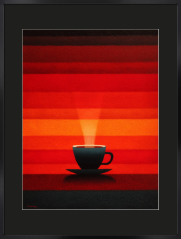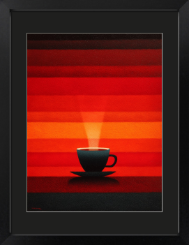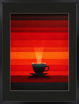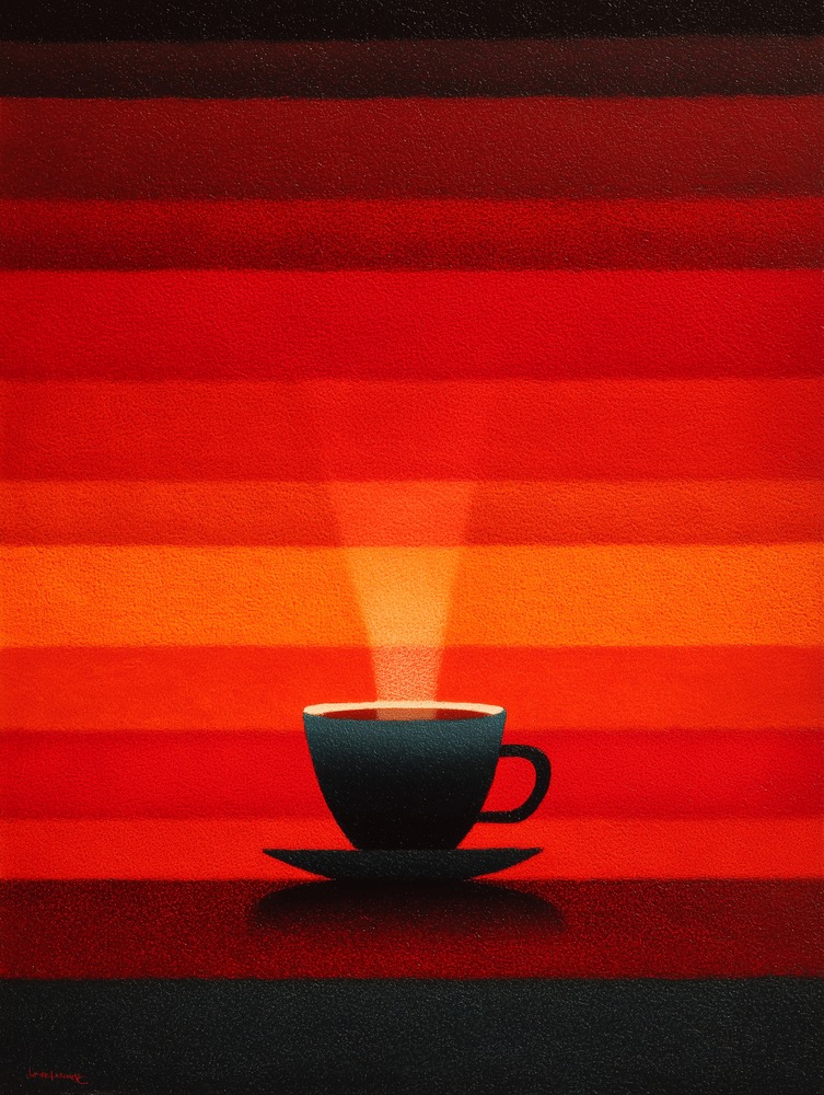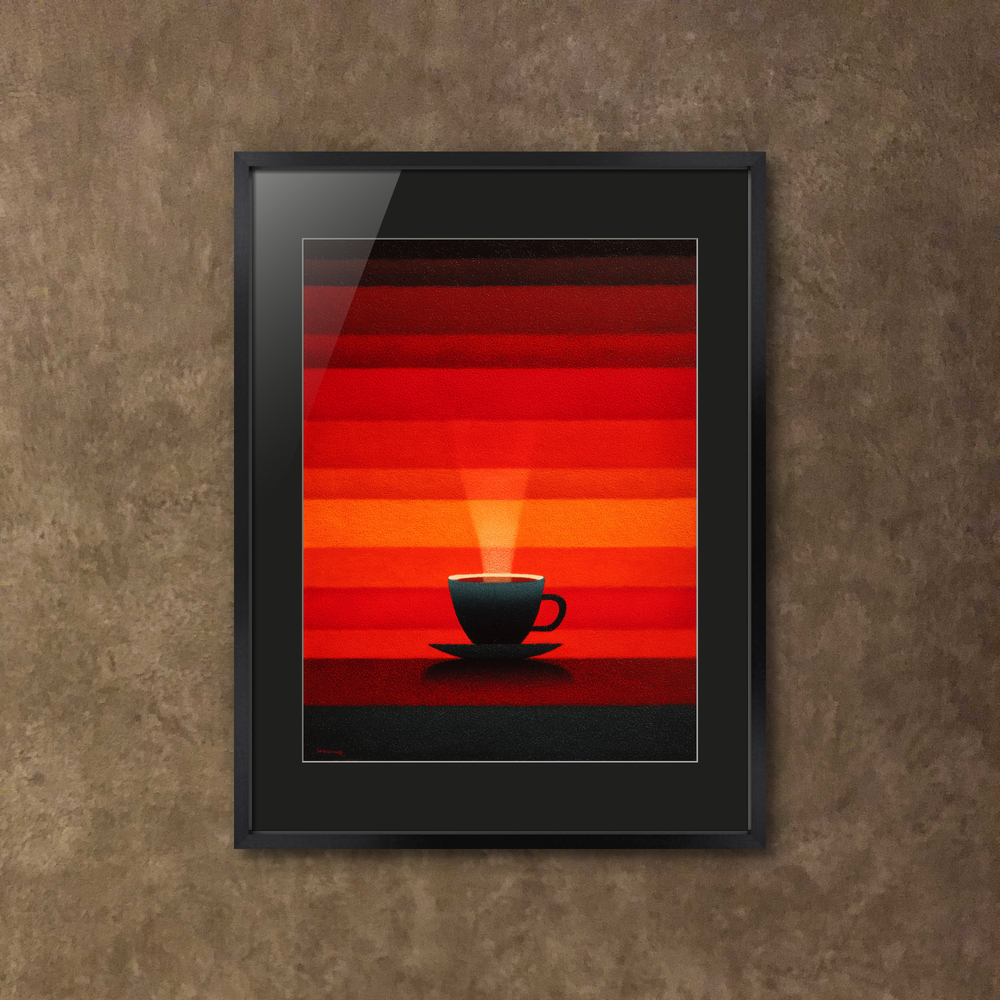 燃えるような空と熱い一杯を重ねて描きました。今日をやりきった自分へ、温かなご褒美をどうぞ。
