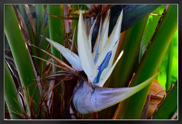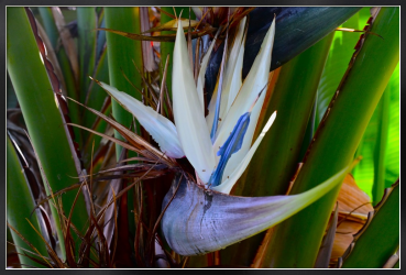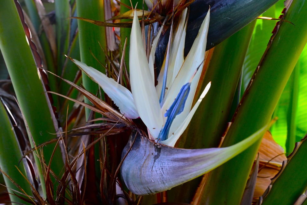 ゴクラクチョウ花の仲間らしい姿です。鮮烈な青と尖った形状が強烈な印象です。 別名、旅人の木、水のみならず、元気もくれそうです。