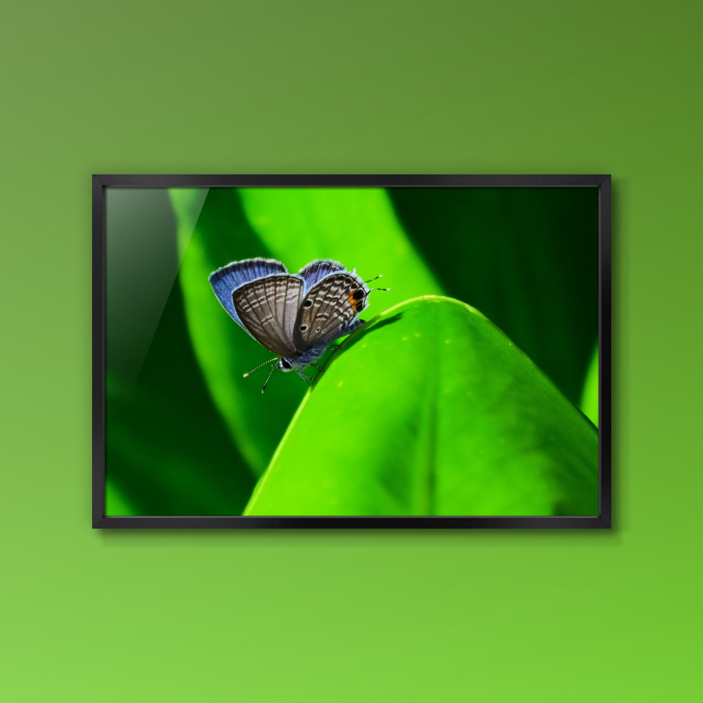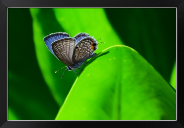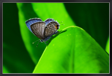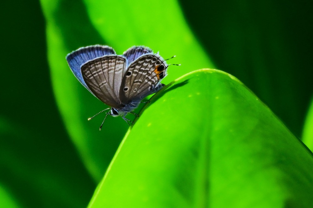 Title:クサトベラの葉の上で朝の逆光に透けるクロマダラソテツシジミ