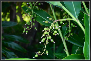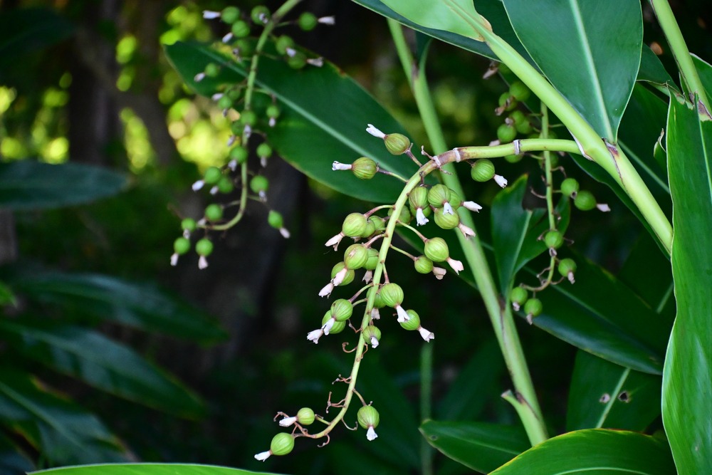 7月には鈴なりの実が目立つ月桃。実の先に白い花の名残を付けたままです。