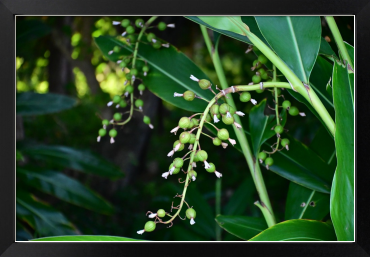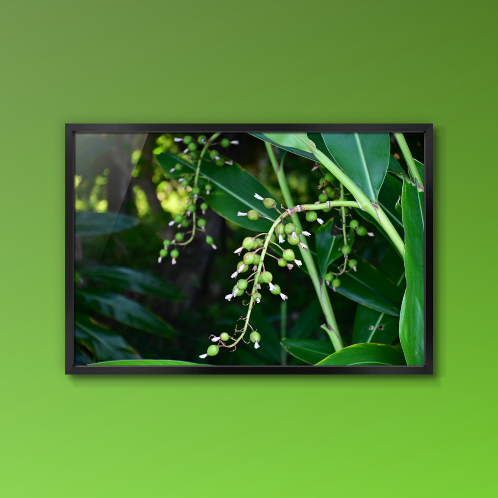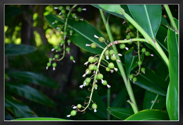 Title:鈴なりの月桃の実の先に白い花の名残も