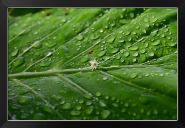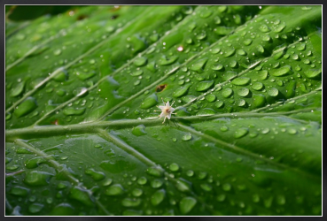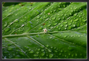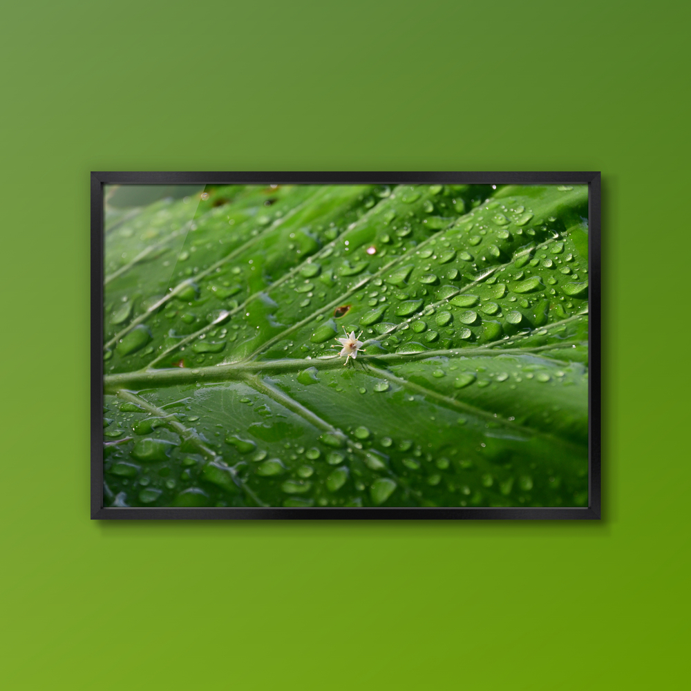 Title:雨上がりの雫をはじく大きな葉と小さな花
