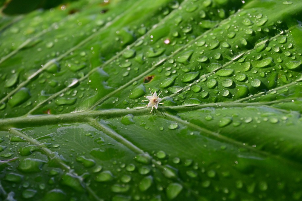 大きなクワズイモの葉の上に、可愛らしい小さなモモタマナの花が乗っていました