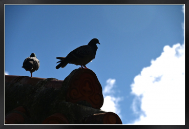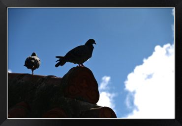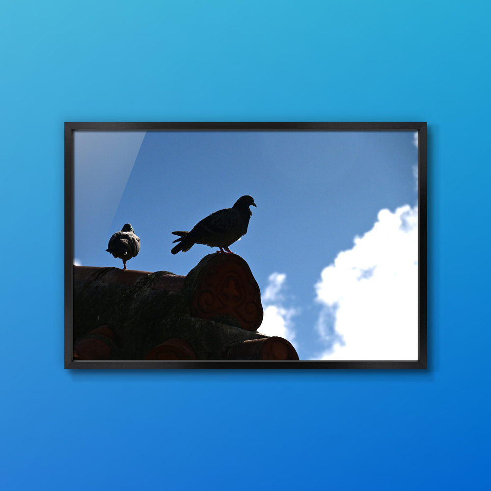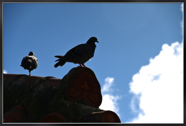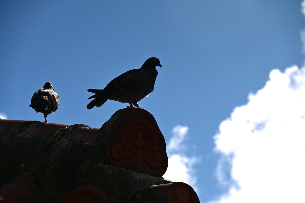 晴天の昼間に東屋の瓦屋根にハトが止まっていました。時間が停止したような世界感でした。
