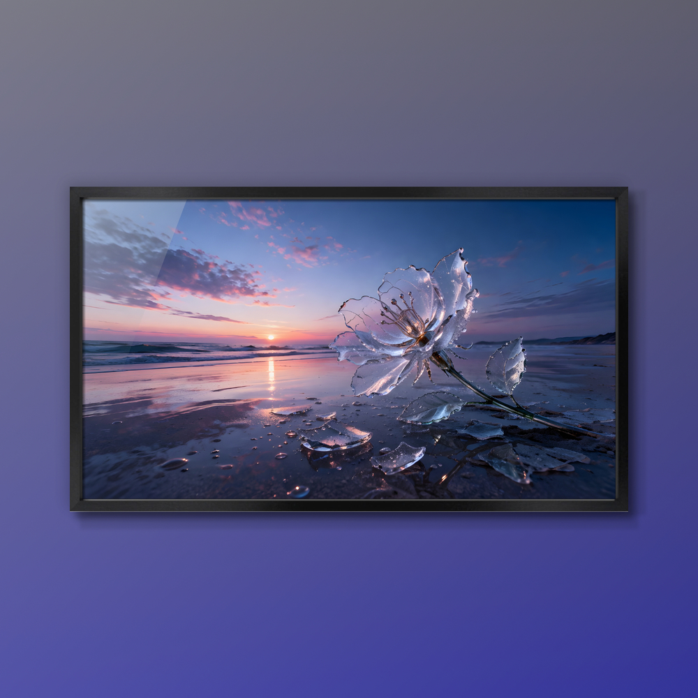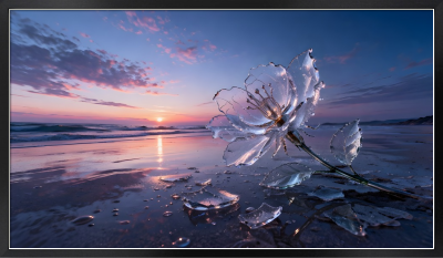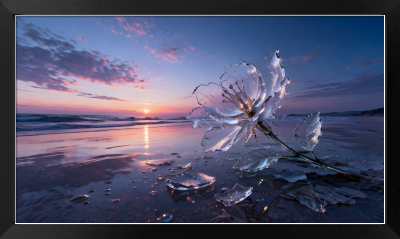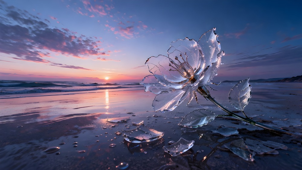 透明な夜明けの景色、枯れずに割れたガラスの花。 AIを利用したアート作品