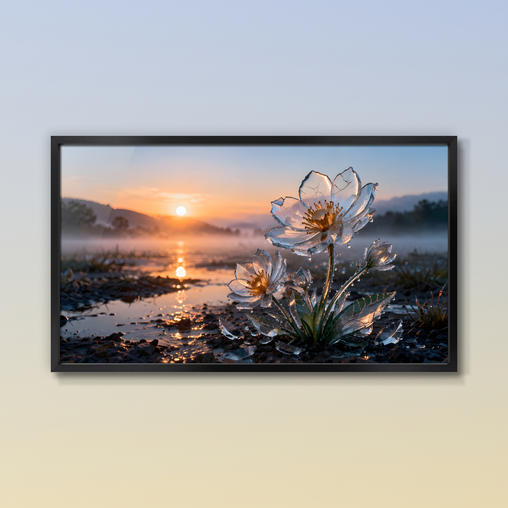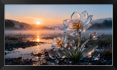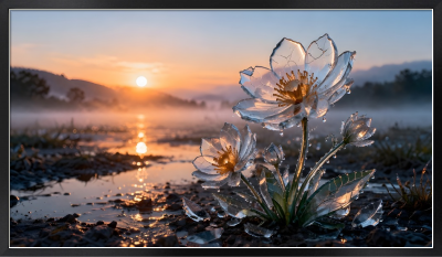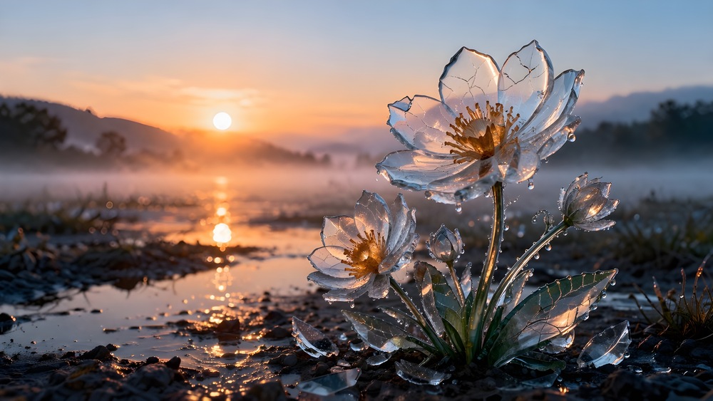 透明な夜明けの景色、枯れずに割れたガラスの花 AIを利用したアート作品
