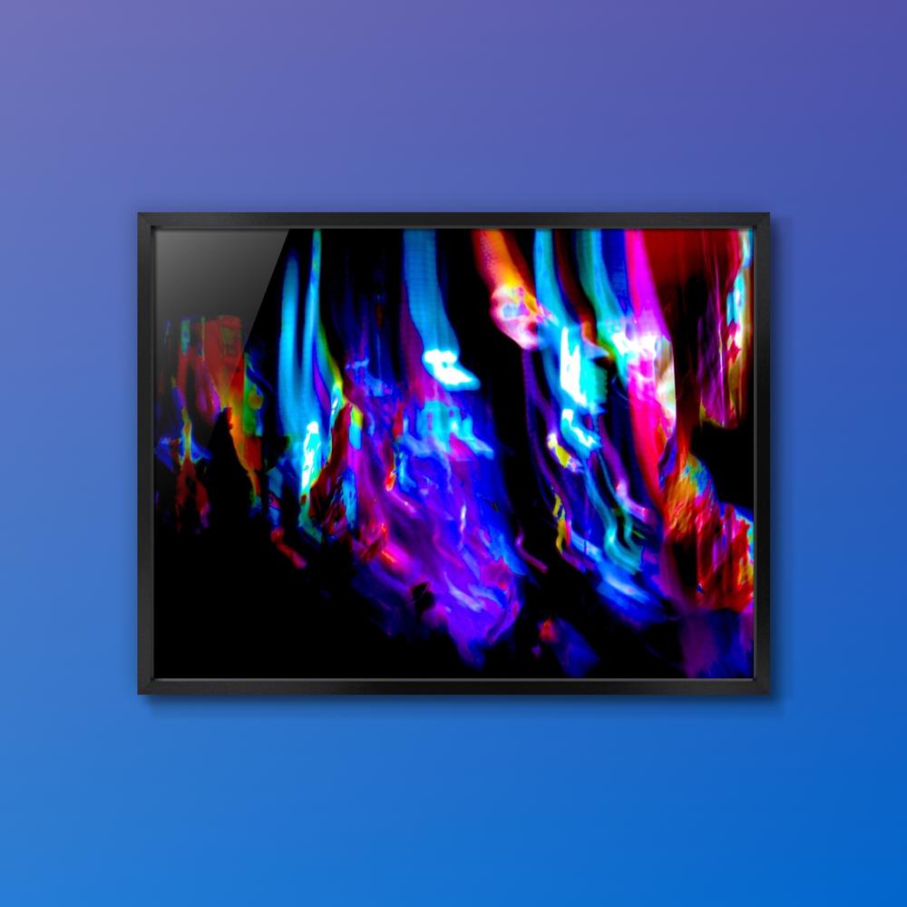 本作「Plasma of Resonance」は、闇の中から光が柱のように立ち上がり、共鳴しながら流動していく瞬間を捉えた作品です。青、紫、紅の発光が重なり合い、液体とも放電ともつかない現象として空間に広がります。縦方向へ引き伸ばされた光の揺らぎは、秩序と乱れが同時に存在する場を感じさせ、evetailが掲げる「計算された美、偶然の感動。」と「数理と感性の交差点」を、発光と共鳴の現象として映し出しています。