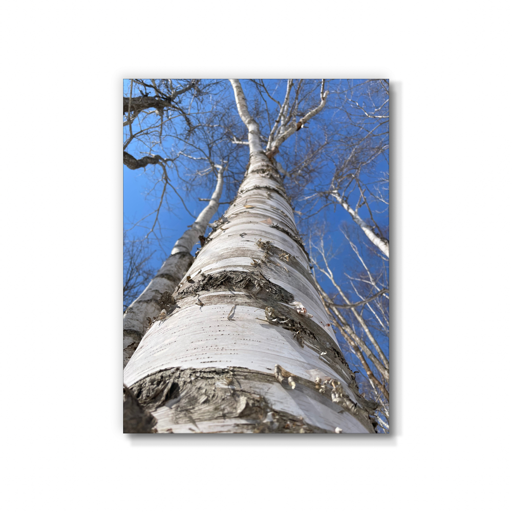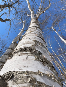 雪解けの晴れた日の白樺林の中で。 春の気配を感じる。