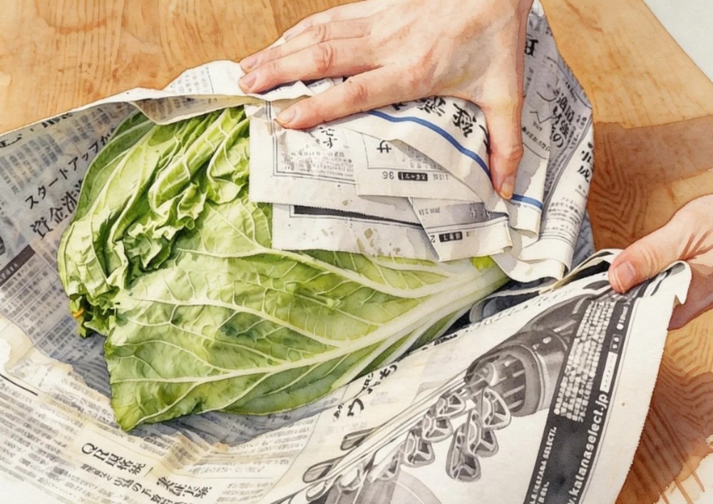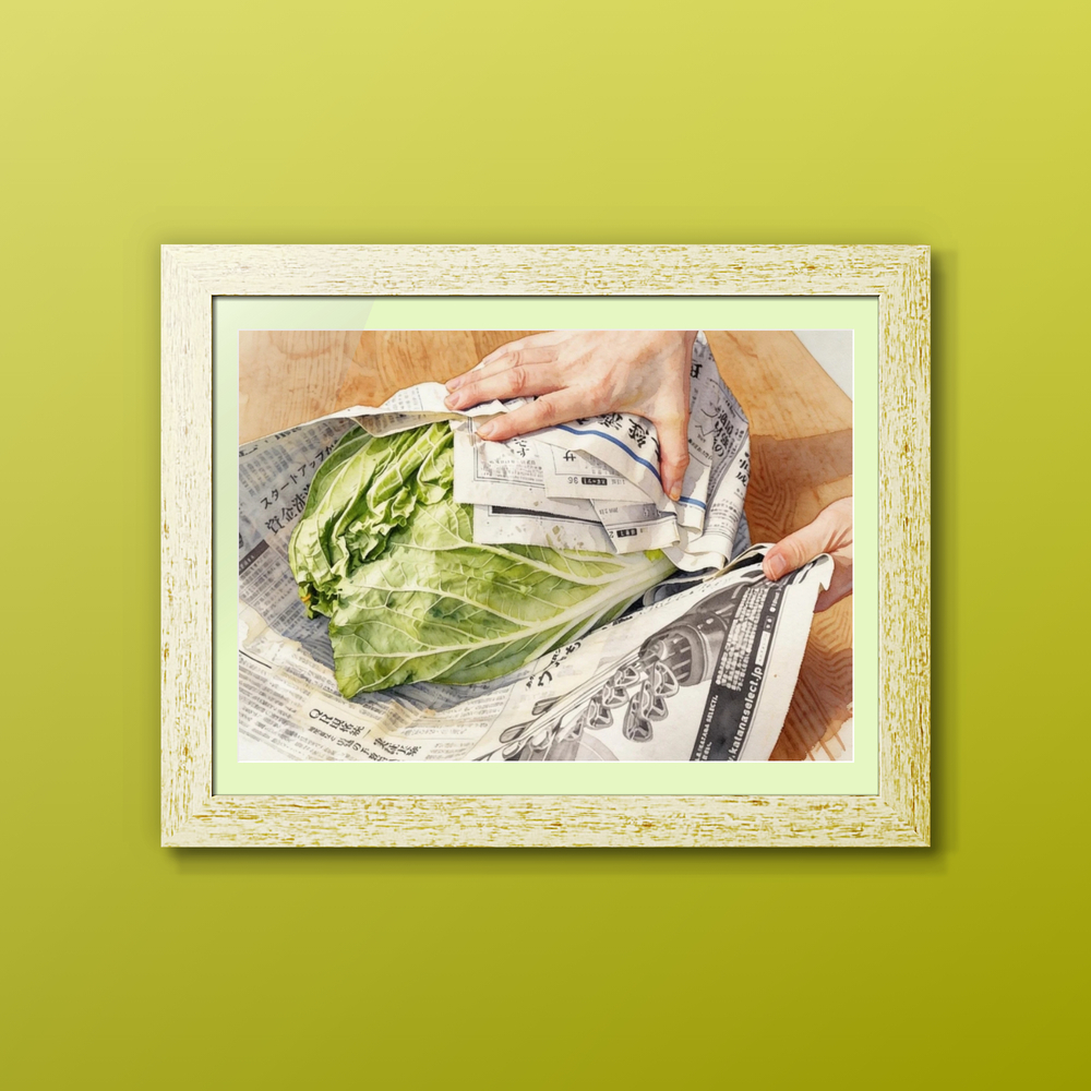 木のテーブルの上で、新聞紙に包まれた白菜を両手で持ち上げている様子が、細部まで丁寧に描かれた水彩画。 新聞紙の質感や文字、白菜の葉脈までがリアルに表現されている。