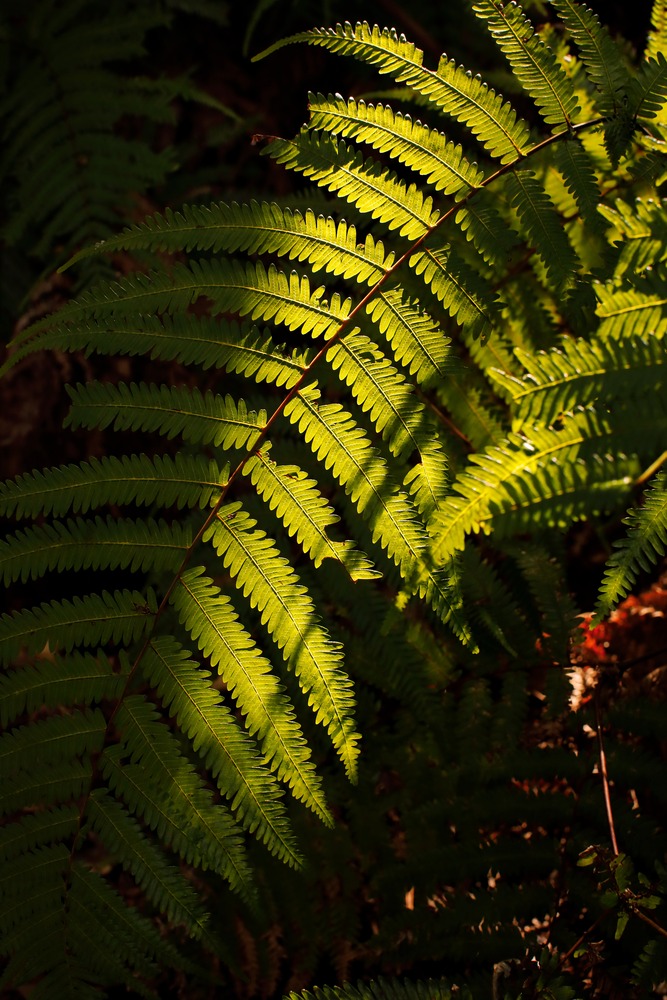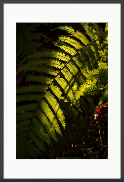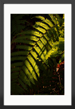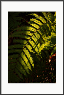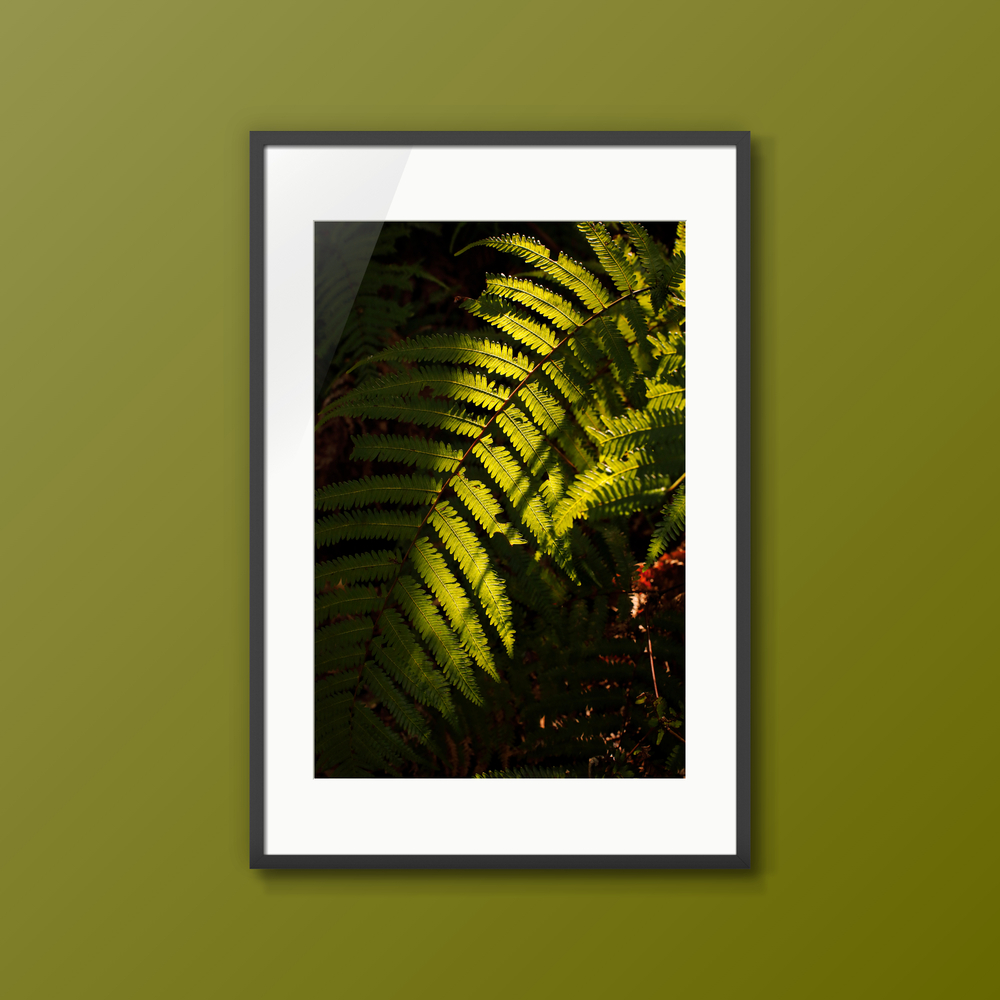 森のなかで見つけた、ふとした瞬間の美しさ。 深い緑に差し込む鋭い日差しと、それによって浮き彫りになるシダの葉のシルエットに惹かれました。 葉の一枚一枚に宿る質感を大切に閉じ込めました。