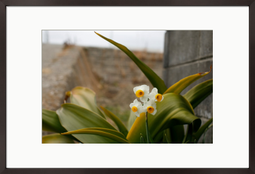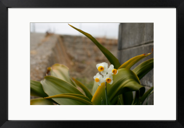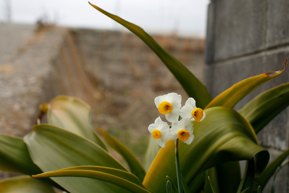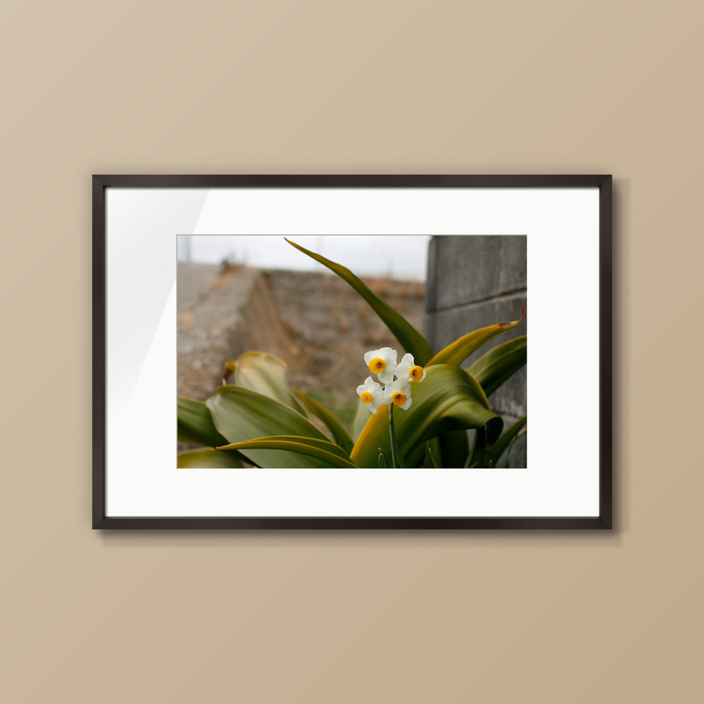 コンクリートの冷たい質感と、土手の無表情な色彩。 その無機質な世界のなかで、凛と、そして可憐に花を咲かせる水仙の姿に惹かれました。 冬の終わりの、冷たく澄んだ空気に触れて見せるその横顔は、 日常の何気ない景色のなかに潜む強さと、静かな喜びを教えてくれるようです。 日々の空間のどこかに、小さな灯のように馴染む一枚であることを願って。