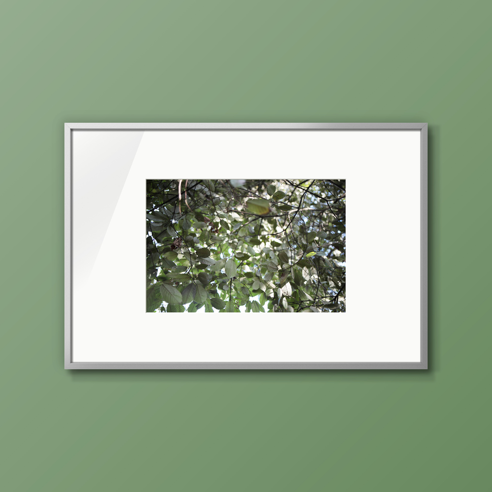 重なり合う葉の隙間から、優しく差し込む木漏れ日。 その一瞬として同じ形に留まらない光の粒と、葉が織りなす繊細なテクスチャーに惹かれました。 写真ならではの解像感で切り取られた緑のグラデーションは、抽象絵画のように、空間に瑞々しい息吹と、心地よい奥行きをもたらします。 清らかな物語を添える一枚になれば幸いです。