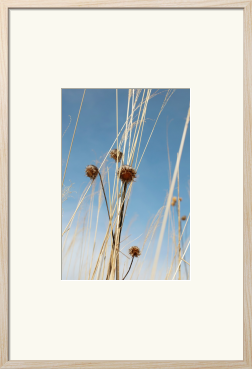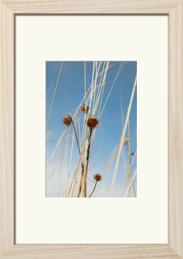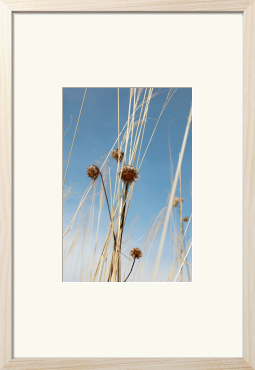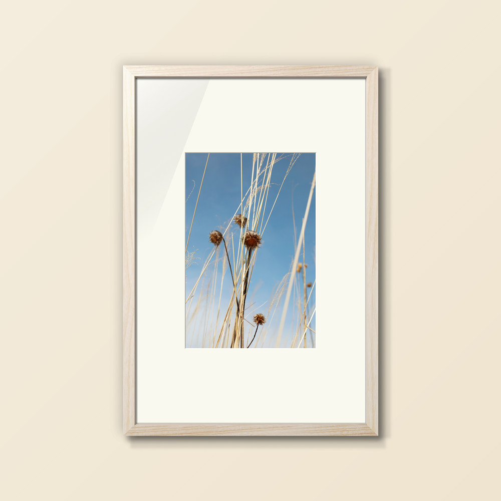 澄んだ青空を背に、凛と立つ枯草と実。 その乾いた質感と、光を孕んで輝く造形美に惹かれました。 写真ならではの解像感で切り取られた枯草のテクスチャーは、抽象画のように、空間に瑞々しい息吹と、心地よい奥行きをもたらします。 リビング、寝室、書斎、あるいは玄関に。 自然の風景画として、日々の暮らしに心落ち着くリラックスした雰囲気を演出します。 どこかで、清らかな物語を添える一枚になれば幸いです。
