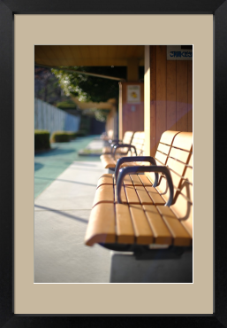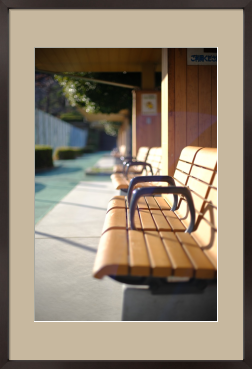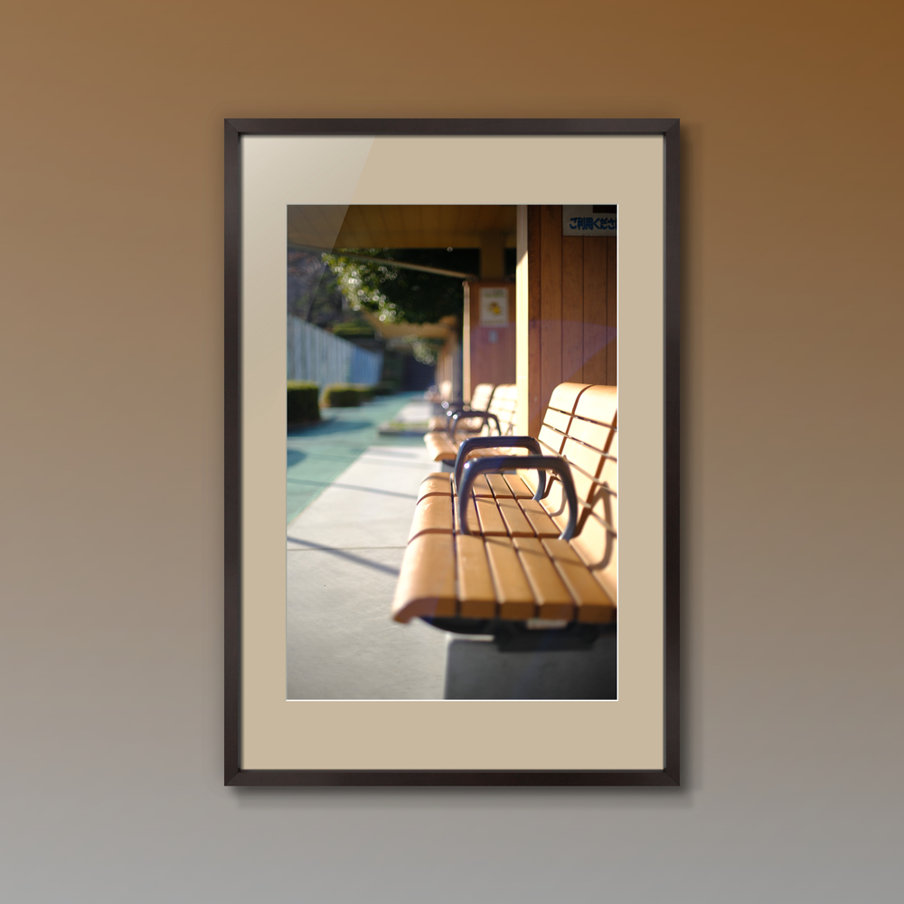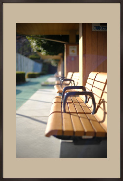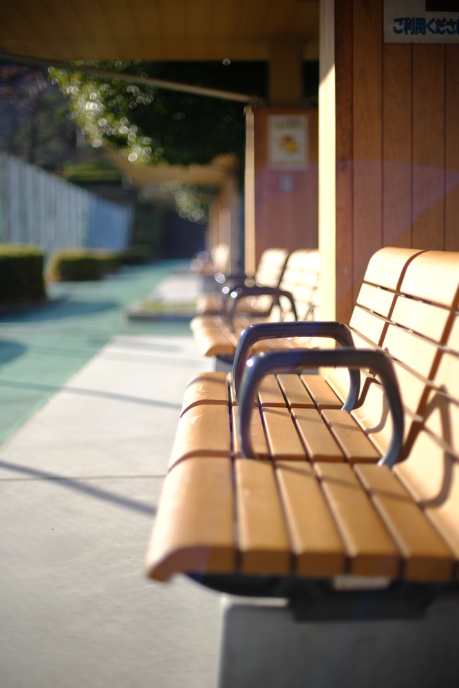 人のいないテニスコート脇のベンチ 酸いも甘いも見届けてきた カメラ:GFX100S レンズ:CANON FD 135mm F2.5 S.C.
