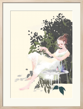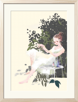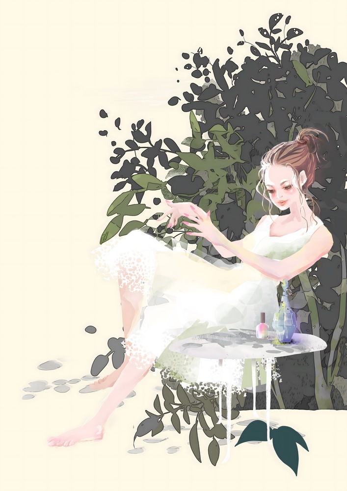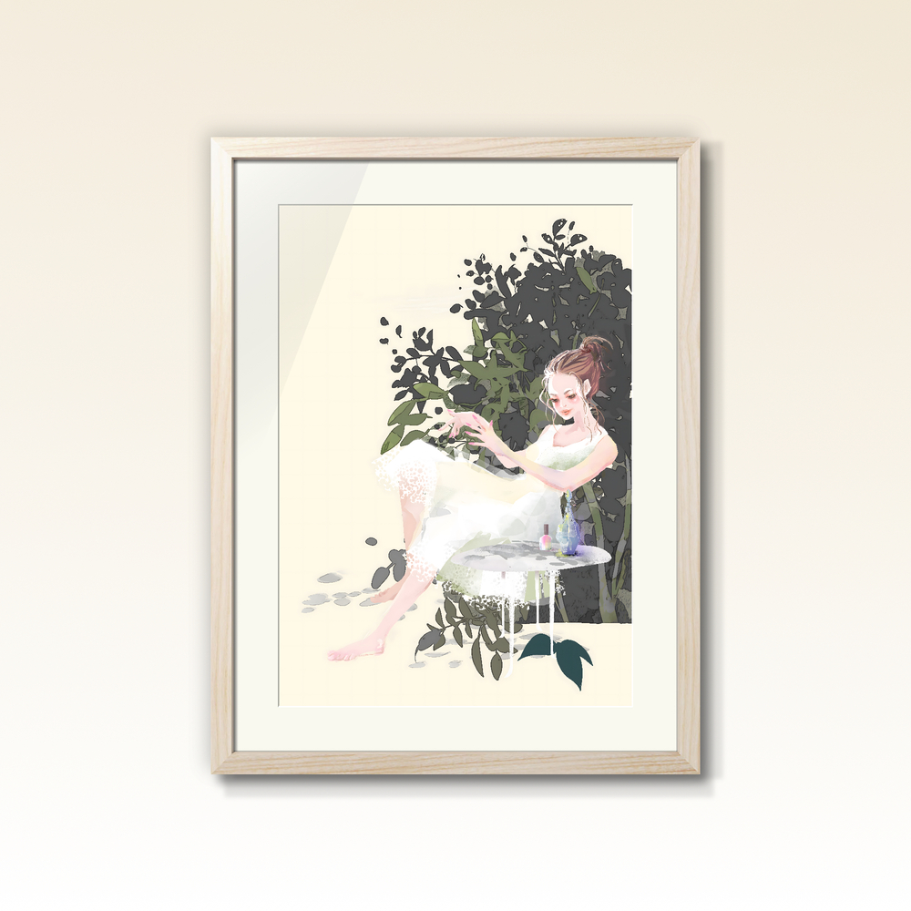 静かな自然との調和と、記憶の中の香りを表現した作品です。 繊細で透明感のある女性像と、それを包み込むような深い緑の植物群のシルエットを対比させています。大きく取られた淡いベージュの背景は、単なる空間ではなく、鑑賞者が深呼吸できる「余白」として機能します。野原を吹き抜ける風の香りや、そこにある静寂そのものを閉じ込めるように描きました。