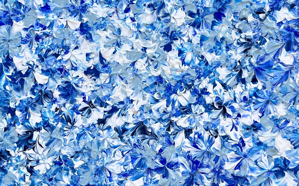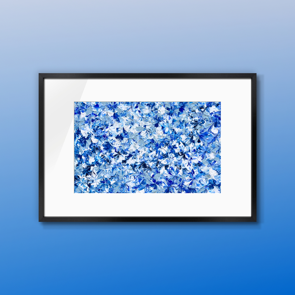 A serene abstract acrylic painting that blooms with soft blue hydrangea flowers. Gentle layers of sky blue and misty lavender create delicate hydrangea clusters with golden highlights. This healing masterpiece awakens quiet elegance and inner calm. Its blossom layers shift beautifully with light. Ideal for living rooms and bedrooms. Available as original or giclée print—let these blue hydrangea blossoms bring gentle elegance and peaceful serenity.