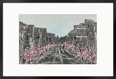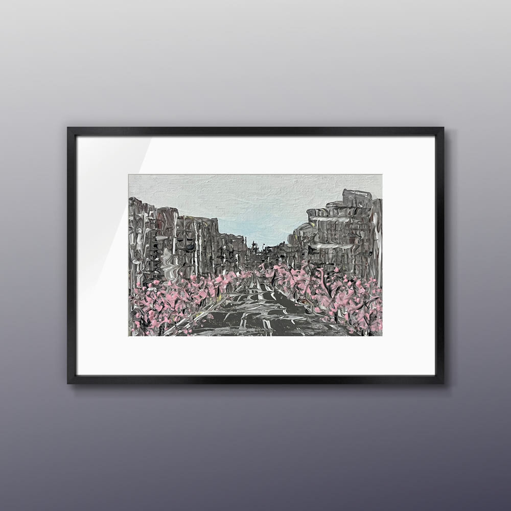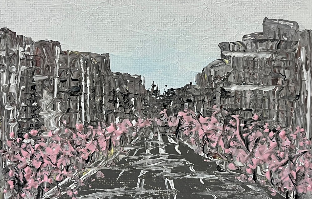 An acrylic abstract painting capturing the gentle bloom of cherry blossoms in the serene light of early morning amidst a cityscape. Hang it in your living space for a touch of tranquility and to savor the fleeting moments of beauty that enliven your surroundings.