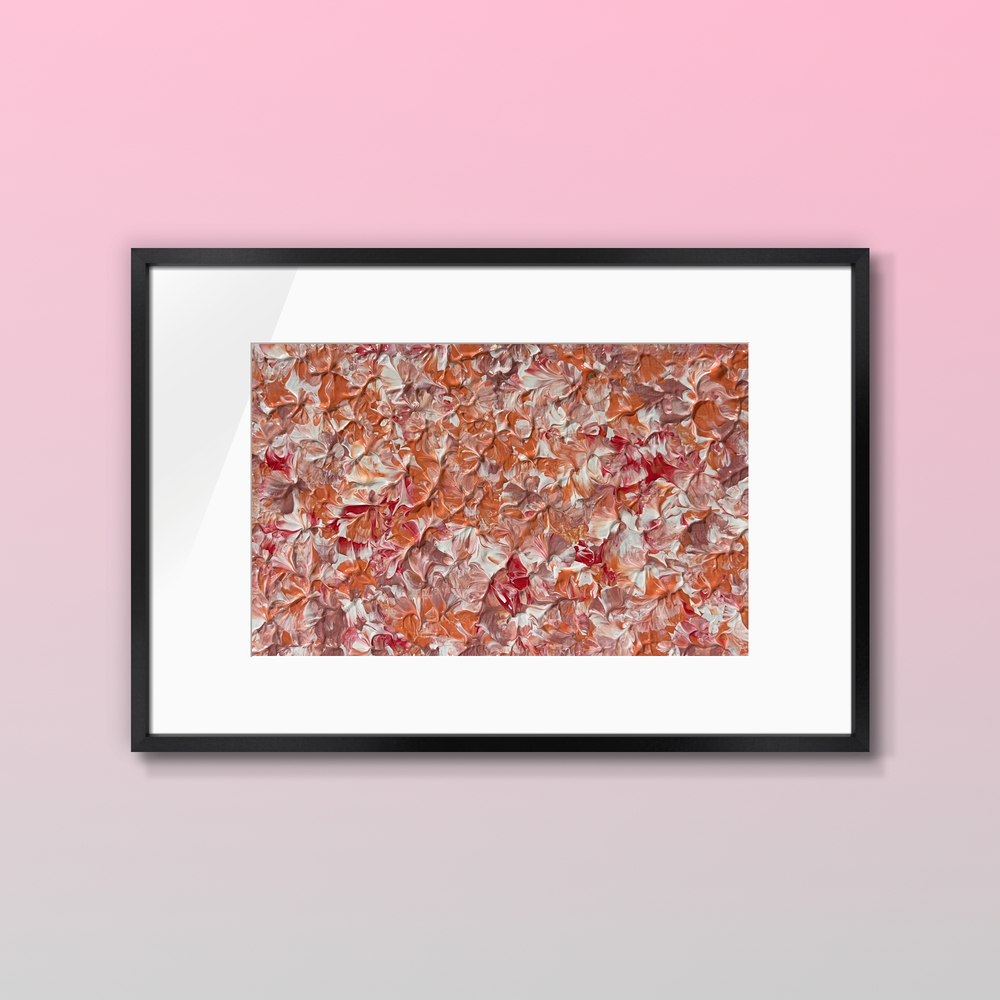 An acrylic abstract painting where fiery oranges and reds merge seamlessly, complemented by crisp whites. Display it in your home or workspace to infuse your environment with warmth, vitality, and a sense of passionate springtime energy.